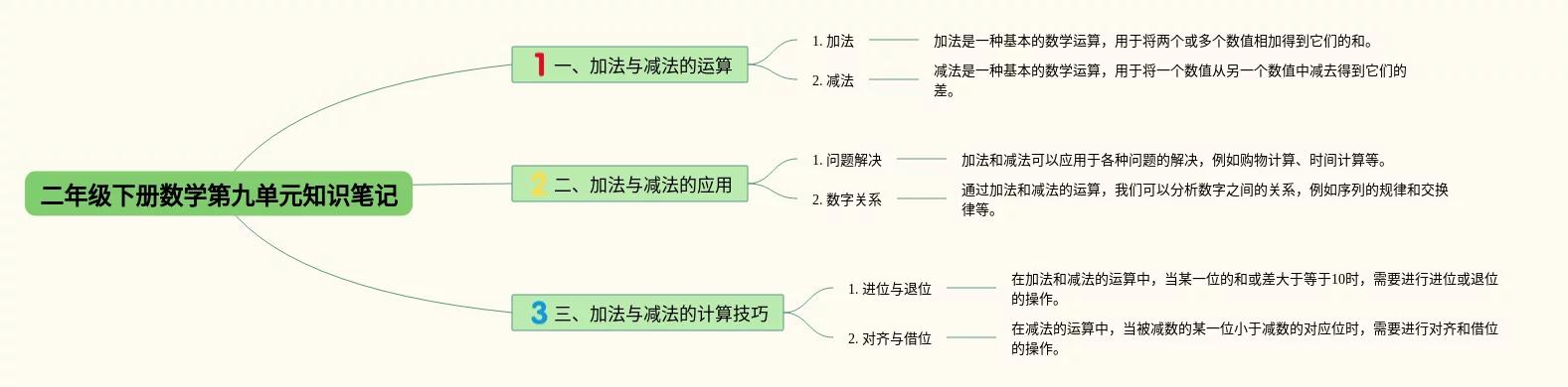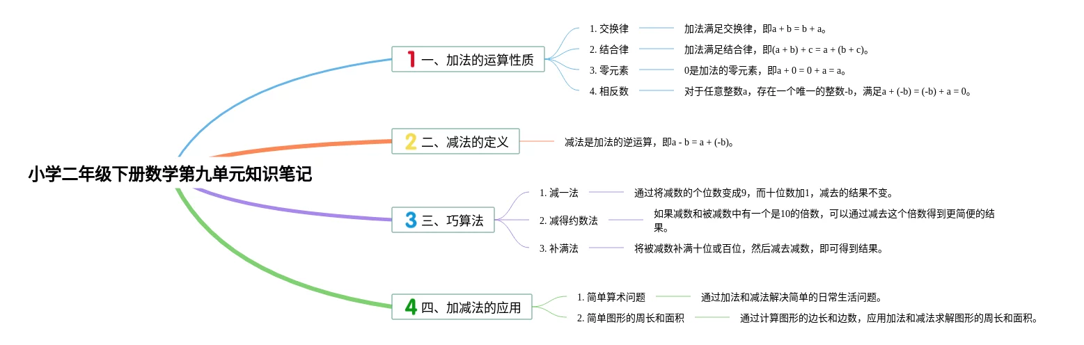小学二年级下册第九单元思维导图汇总,内容涵盖加法的运算性质、减法的定义、巧算法、加减法的应用等4个部分,每张思维导图都非常清晰,每张图片均可下载。