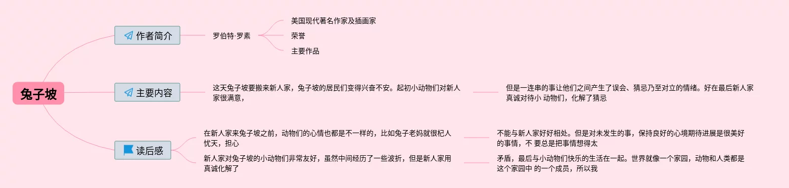 3张兔子坡故事思维导图汇总,内容涵盖作者简介、主要内容、读后感等3个要点,每张思维导图都非常漂亮,每张图片均附打印高清版。