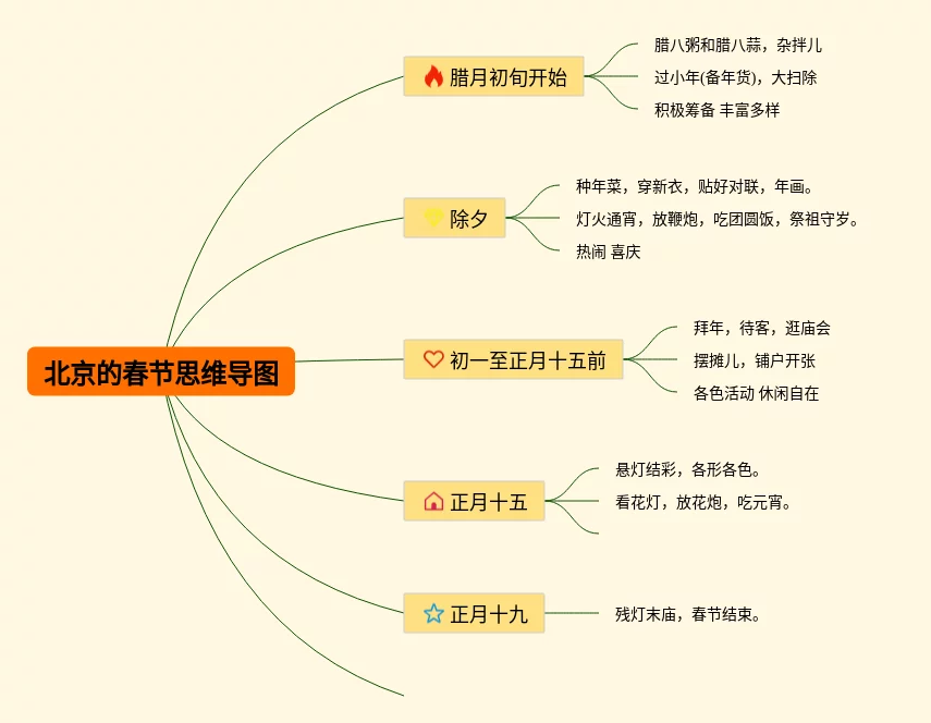 《北京的春节》思维导图.(4个可打印) author: 百分思维 2023-10-08 04:31:16 阅读:95 点赞:0 4个《北京的春节》思维导图.合集,内容涵盖腊八等1个部分,每张思维导图都非常简单,每张图片均可打印。第1张,《北京的春节》.思维导图高清晰可打印在线编辑预览第2张,《北京的春节》.思维导图精选版在线编辑预览第3张,《北京的春节》.思维导图附下载在线编辑预览第4张,《北京的春节》.思维导图可下载在线编辑预览思维导图知识点说明:腊月二十三:过小年,是春节的“彩排”除夕以前:贴春联除夕:赶做年菜初一:休息初六:逛庙会元宵:悬灯结彩正月十九:春节结束腊八:熬腊八粥 下载地址1 下载地址2 下载地址3 Tags: 北京 春节 打印 导图 思维