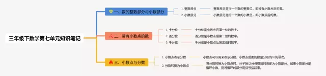 3个三年级下数学第七单元的思维导图合集,内容涵盖数的整数部分与小数部分、带有小数点的数、小数点与分数等3个部分,每张思维导图都非常简单,每张图片均高清晰可打印。