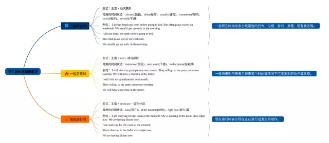 3张现在进行时一般将来时一般现在时思维导图合集,内容涵盖一般现在时、一般将来时、现在进行时等3个要点,每张思维导图都非常简单,每张图片均附下载。