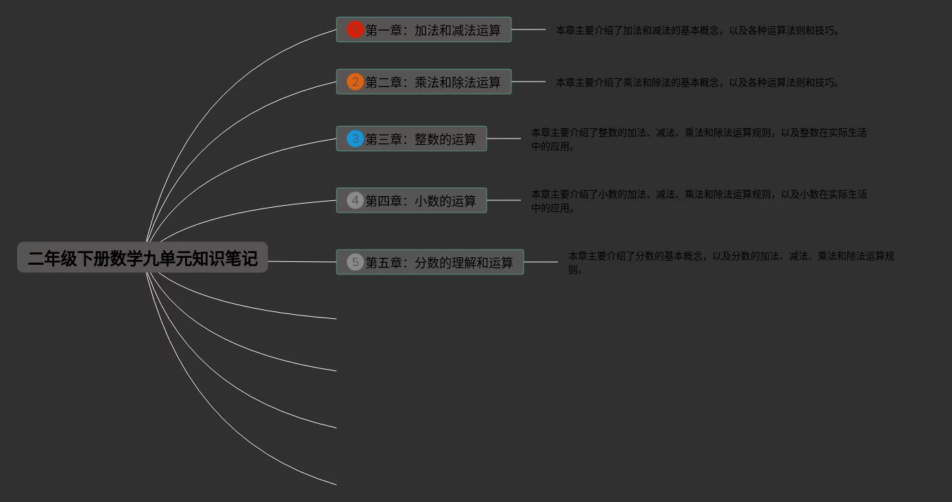 4张思维导图二年级下册数学九单元汇总,内容涵盖二年级下册数学九单元、第一章加法与减法、第二章乘法的概念、第三章乘法的运算法则、第四章除法的概念等10个要点,每张思维导图都非常简单,每张图片均附下载。