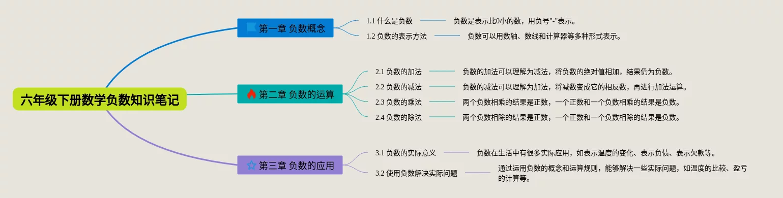 - 2.2 负数的减法:负数的减法可以理解为加法,将减数变成它的相反数,再进行加法运算。