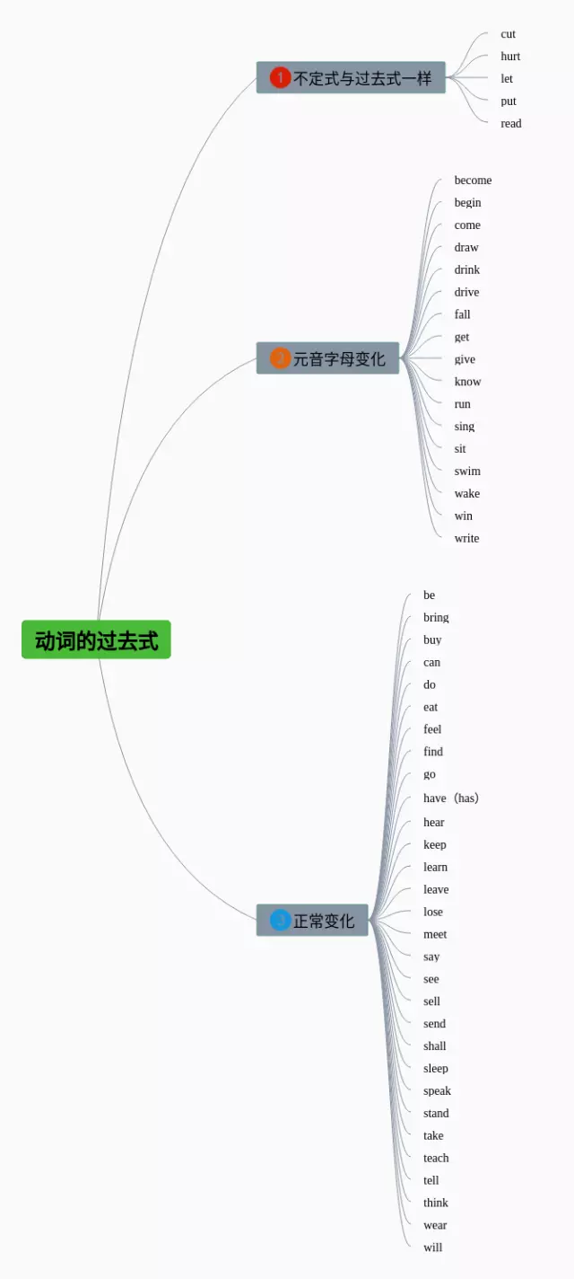 六年级英语动词过去式思维导图(4张可下载) author: 百分思维 2023-08-02 11:10:28 阅读:86 点赞:0 4张六年级英语动词过去式思维导图合集,内容涵盖不定式与过去式一样、元音字母变化、正常变化等3个方面,每张思维导图都非常漂亮,每张图片均可下载。第1张,六年级动词过去式思维导图高清版在线编辑预览第2张,六年级动词过去式思维导图高清版在线编辑预览第3张,六年级动词过去式思维导图附打印高清版在线编辑预览第4张,六年级动词过去式思维导图值得收藏在线编辑预览思维导图知识点说明:不定式与过去式一样:cut元音字母变化:become正常变化:be 下载地址1 下载地址2 下载地址3 Tags: 导图 动词 六年级 思维 下载