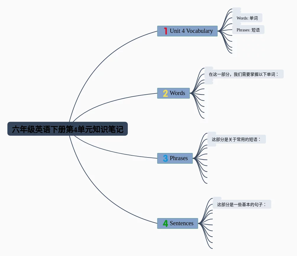 六年级下册第4单元思维导图合集,六年级英语下册第4单元思维导图,内容涵盖单词、短语、句子等3个要点,20张高清晰可打印,每张思维导图都非常简单,每张图片均高清晰可打印。