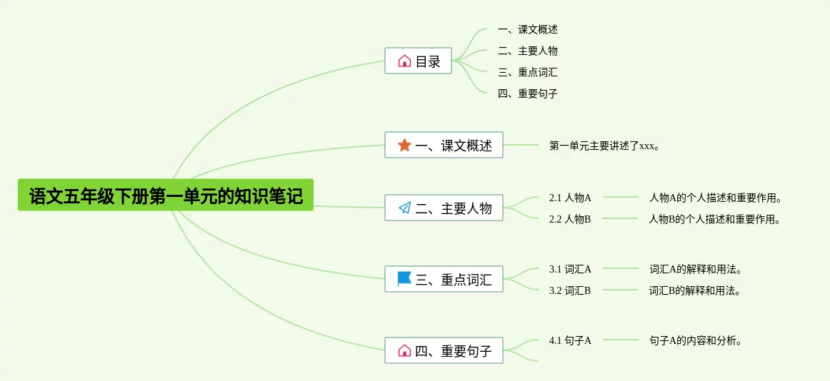 24张五年级下册第一单元的思维导图语文汇总,五年级下册第一单元的思维导图语文,内容涵盖课文内容、重点词汇、重要人物、学习目标等4个方面,24张精选版,每张思维导图都非常漂亮,每张图片均精选版。