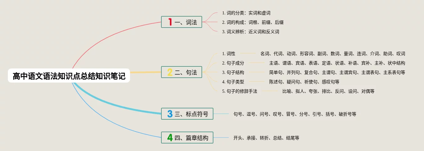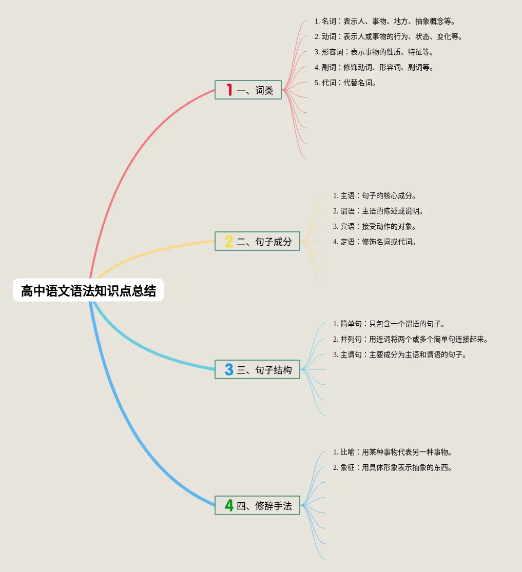 25张高中语文知识点思维导图合集,高中语文知识点思维导图,内容涵盖词法、句法、标点符号、篇章结构等4个知识点,25张高清晰可打印,每张思维导图都非常漂亮,每张图片均高清晰可打印。