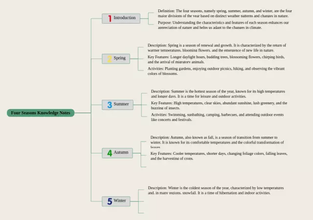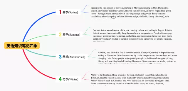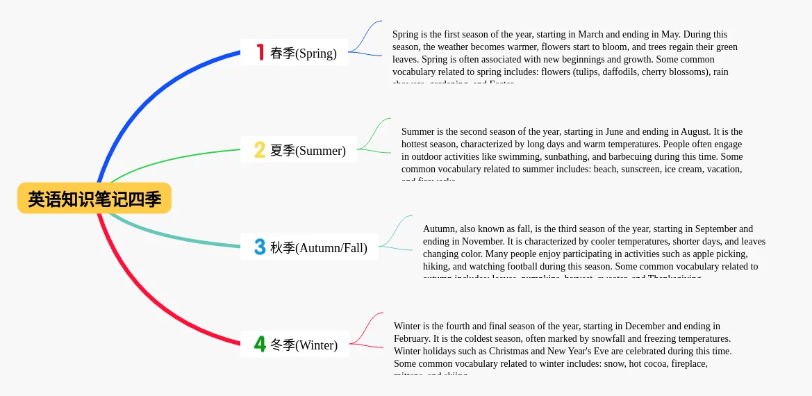 23张四季英语的思维导图汇总,四季英语的思维导图,内容涵盖目录、Spring(春季)、Summer(夏季)、Autumn/Fall(秋季)、Winter(冬季)等5个部分,23张可打印,每张思维导图都非常简单,每张图片均可打印。