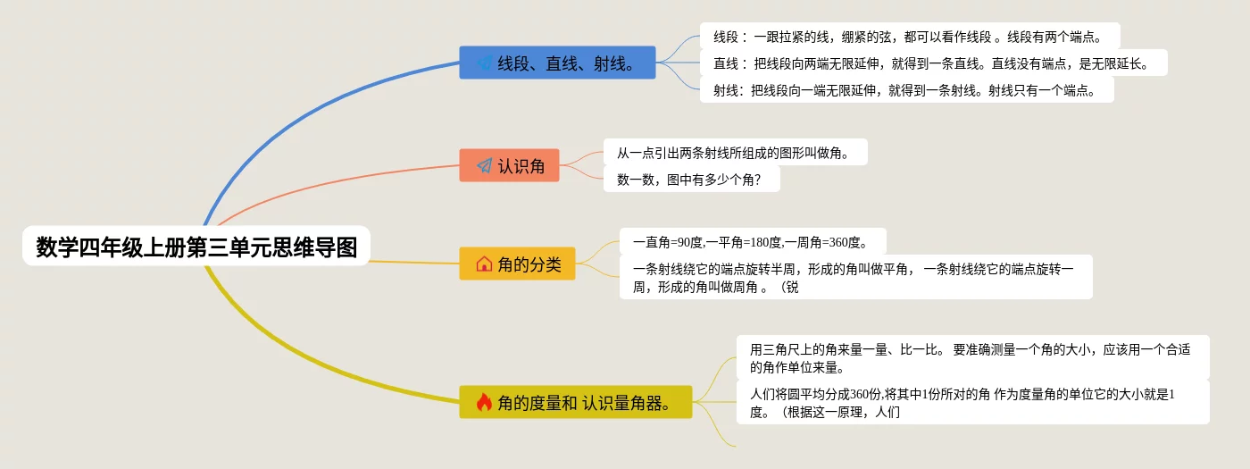 20张四年级下册第三单元知识思维导图合集,四年级下册第三单元知识思维导图,内容涵盖线段、直线、射线、认识角、角的分类、角的度量和认识量角器等4个知识点,20张附打印高清版,每张思维导图都非常清晰,每张图片均附打印高清版。