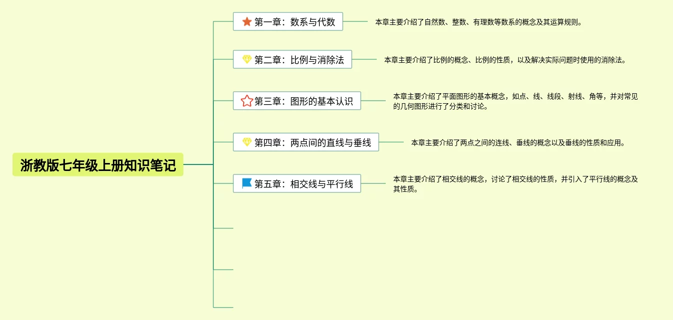 22张数学七年级下册浙教版第一单元思维导图合集,数学七年级下册浙教版第一单元思维导图,内容涵盖1. 第一章物质构成、2. 第二章元素与化合物、3. 第三章常见物质的性质和应用等3个部分,22张可下载,每张思维导图都非常清晰,每张图片均可下载。