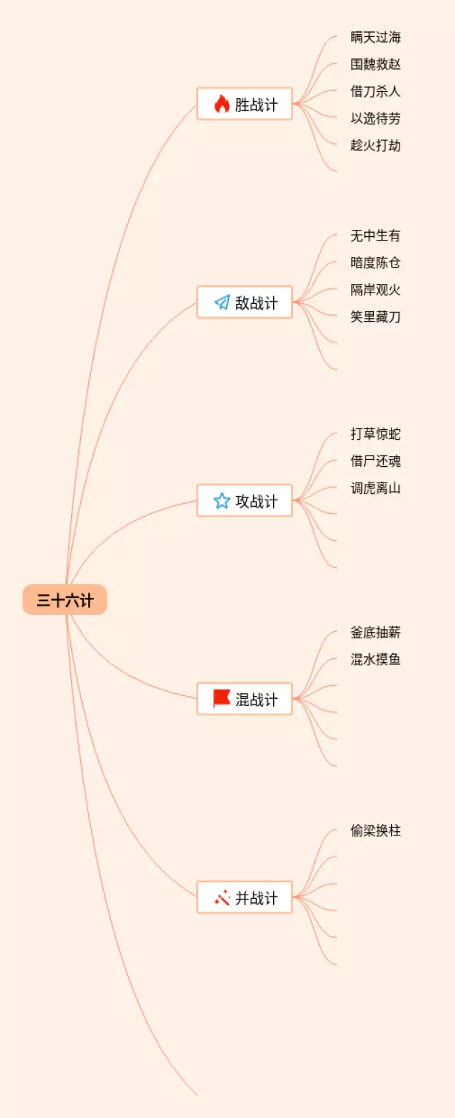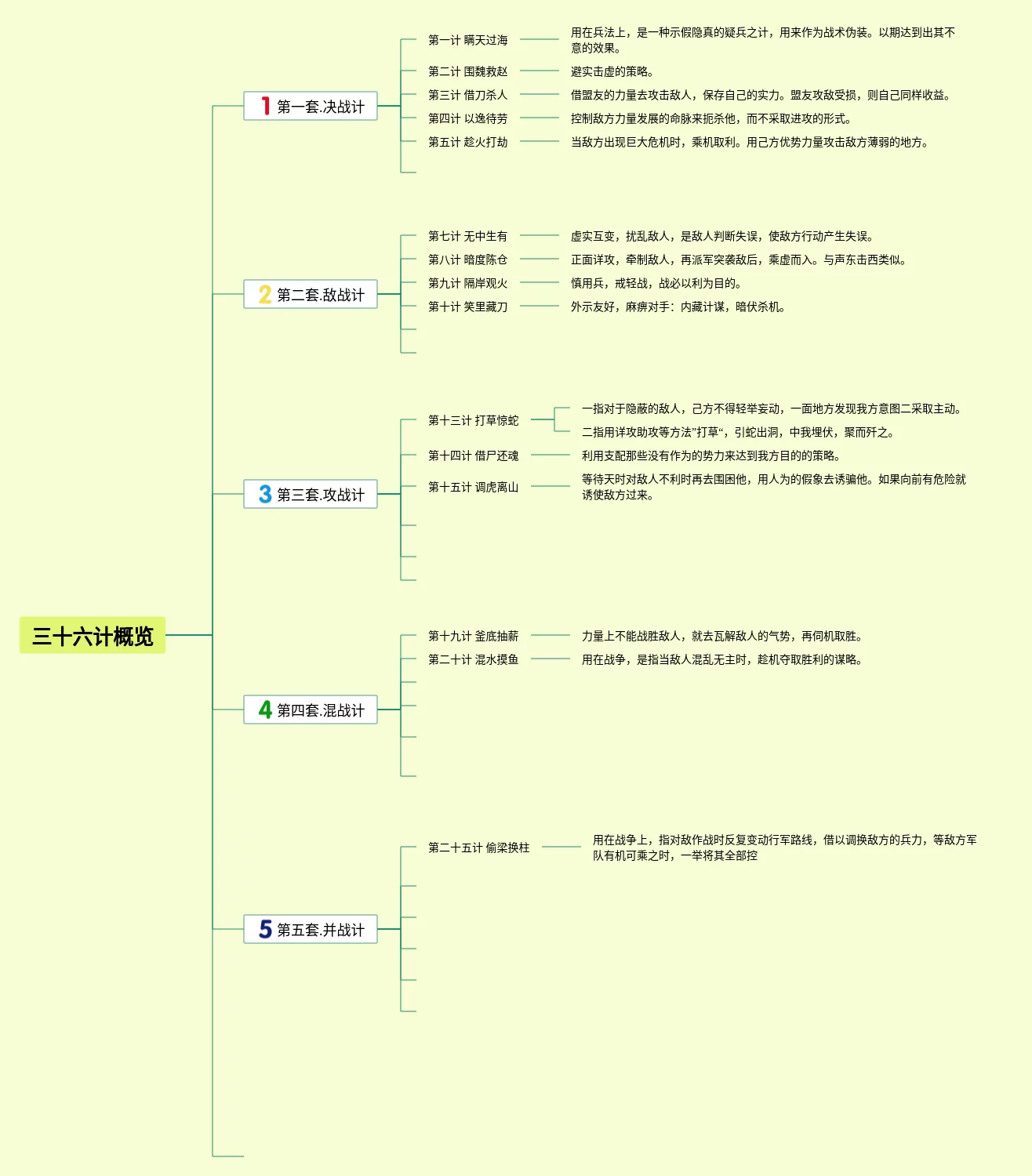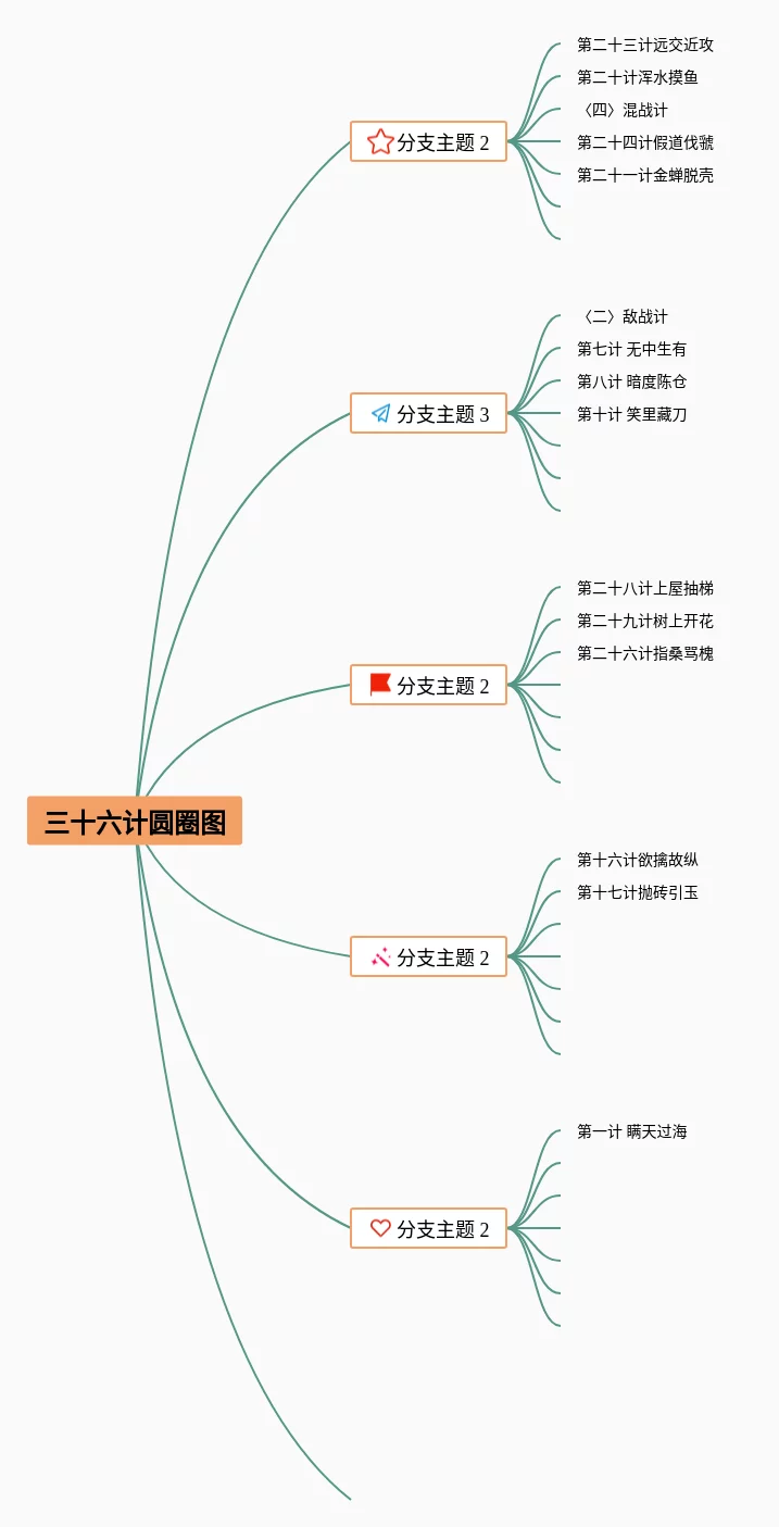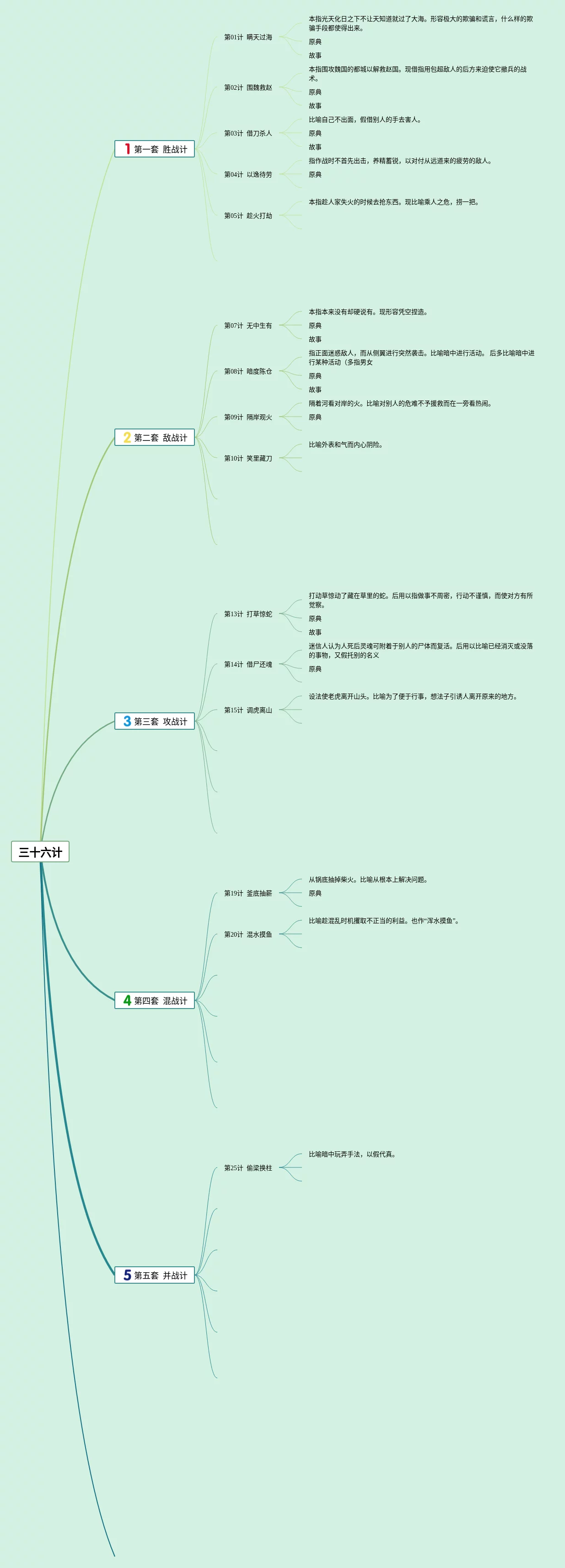 23张三十六计的思维导图汇总,三十六计的思维导图,内容涵盖第一套 胜战计、第二套 敌战计、第三套 攻战计、第四套 混战计、第五套 并战计等6个方面,23张值得收藏,每张思维导图都非常简单,每张图片均值得收藏。