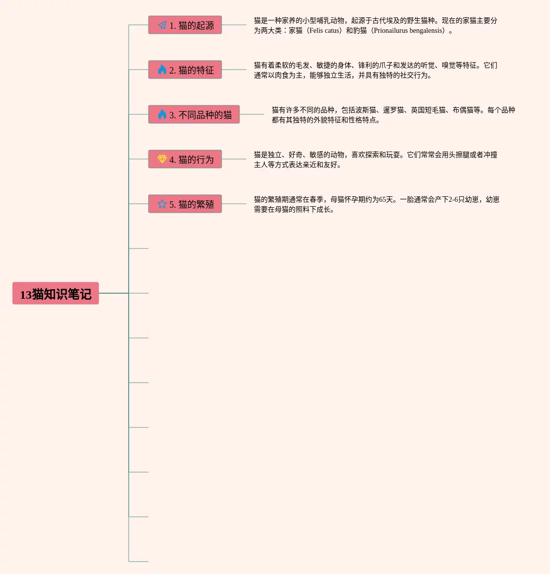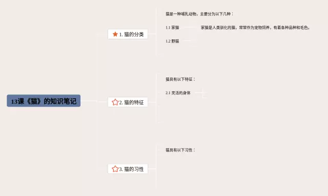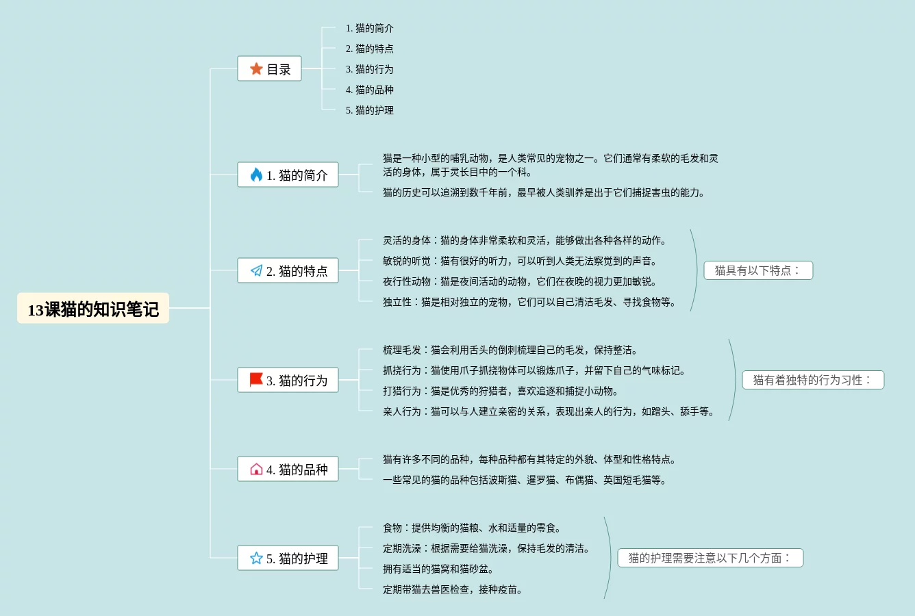 24张13课猫的思维导图合集,13课猫的思维导图,内容涵盖目录、1. 猫的特征、2. 猫的品种、3. 猫的行为、4. 猫的护理等5个知识点,24张可下载,每张思维导图都非常简单,每张图片均可下载。