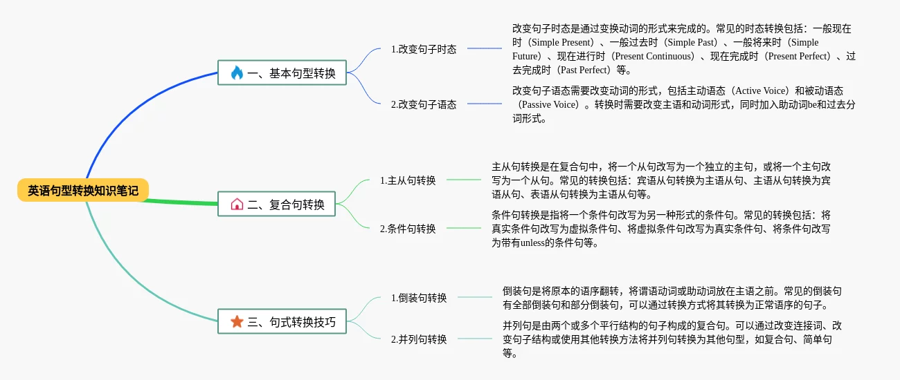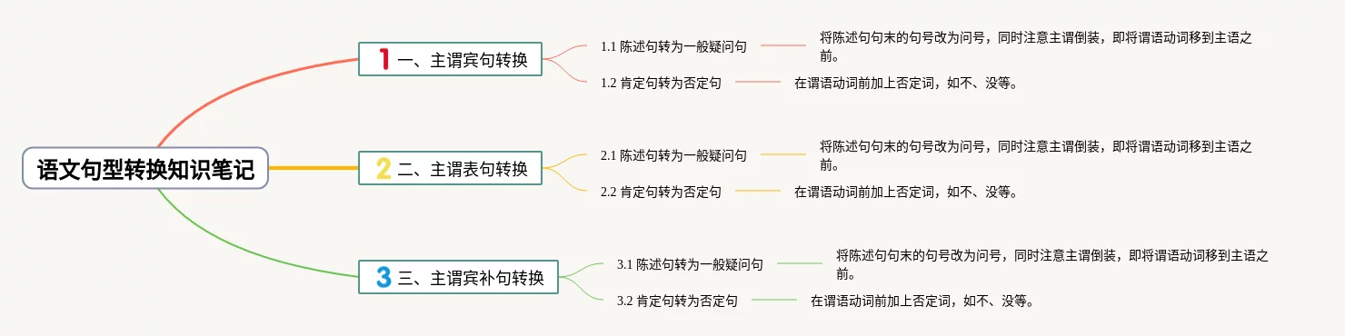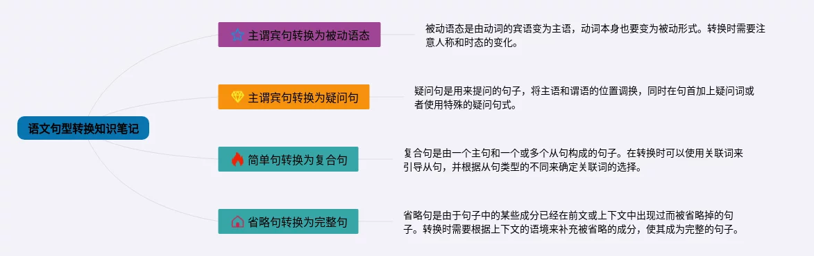 24张语文句型转换思维导图汇总,语文句型转换思维导图,内容涵盖主谓宾句转换、主谓表句转换、主谓宾补句转换等3个知识点,24张可打印,每张思维导图都非常简单,每张图片均可打印。