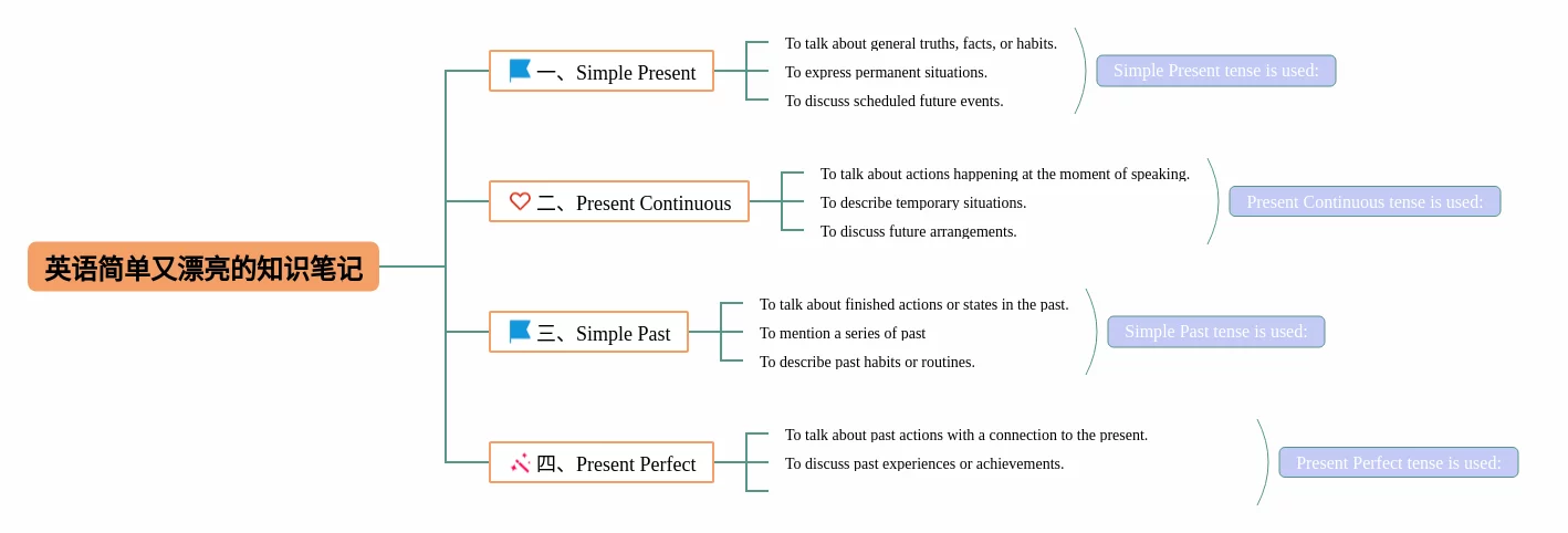 21张英语四个时态的思维导图五年级合集,英语四个时态的思维导图五年级,内容涵盖一般现在时 (Simple Present)、一般过去时 (Simple Past)、现在进行时 (Present Continuous)、将来时 (Future Tense)等4个部分,21张附打印高清版,每张思维导图都非常清晰,每张图片均附打印高清版。