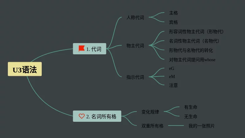 22张四年级下册英语u3思维导图简单合集,四年级下册英语u3思维导图简单,内容涵盖1. 代词、2. 名词所有格等2个知识点,22张高清版,每张思维导图都非常清晰,每张图片均高清版。