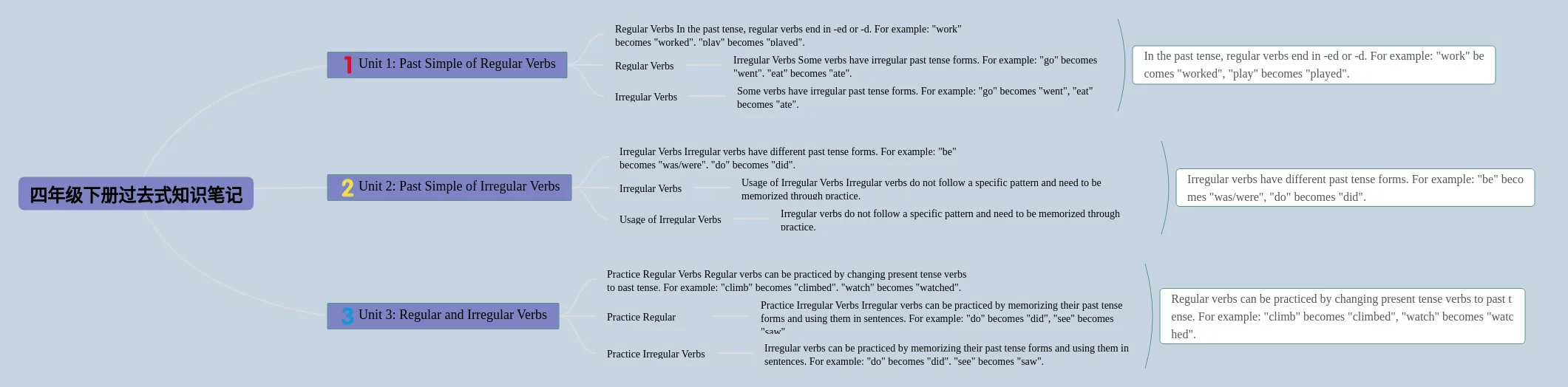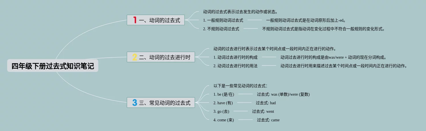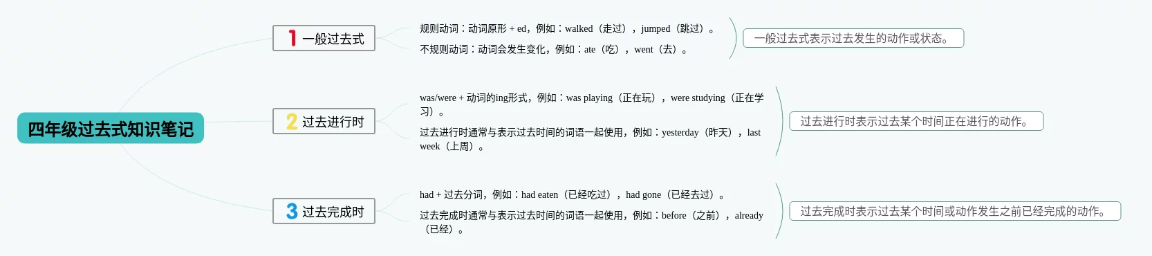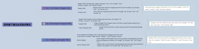25张四年级下册过去式思维导图合集,四年级下册过去式思维导图,内容涵盖一般过去式、过去进行时、过去完成时等3个要点,25张高清版,每张思维导图都非常漂亮,每张图片均高清版。