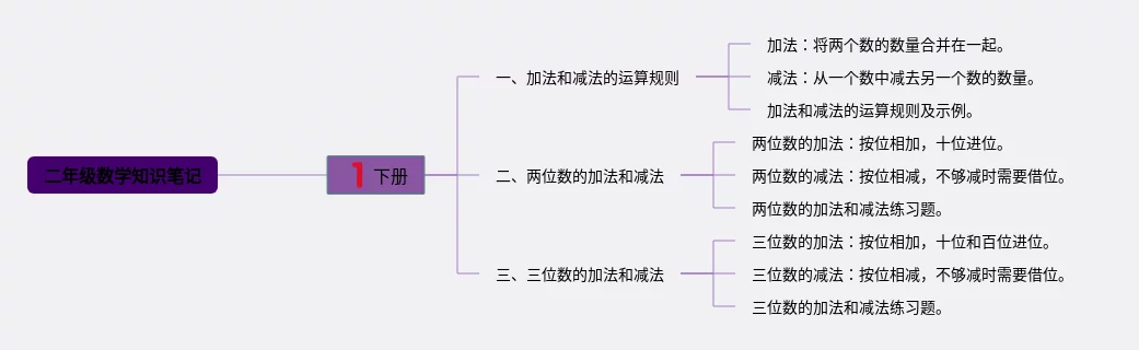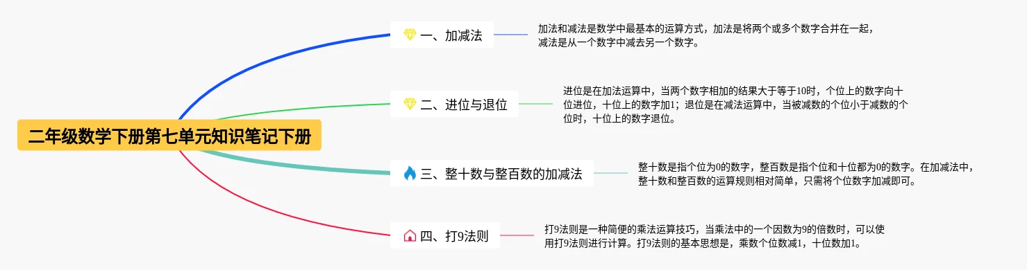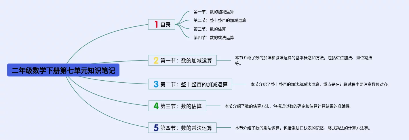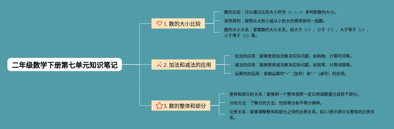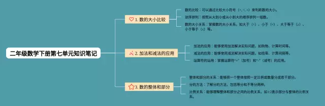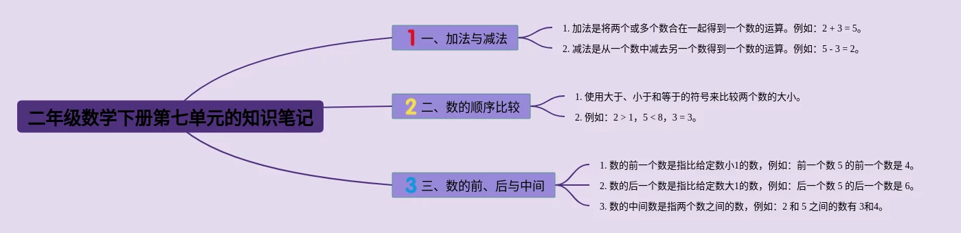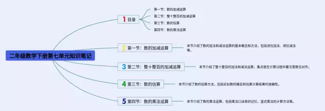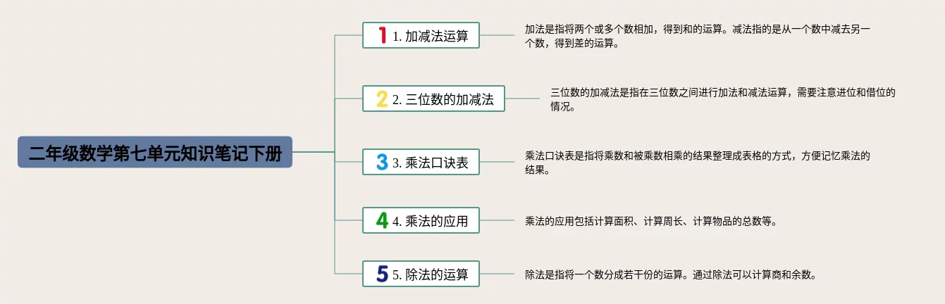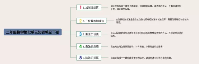 二年级下册第七单元思维导图汇总,二年级数学下册思维导图第七单元,内容涵盖1. 数的大小比较、2. 加法运算、3. 减法运算、4. 乘法运算、5. 除法运算等5个知识点,22张可打印,每张思维导图都非常漂亮,每张图片均可打印。