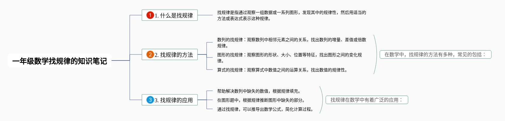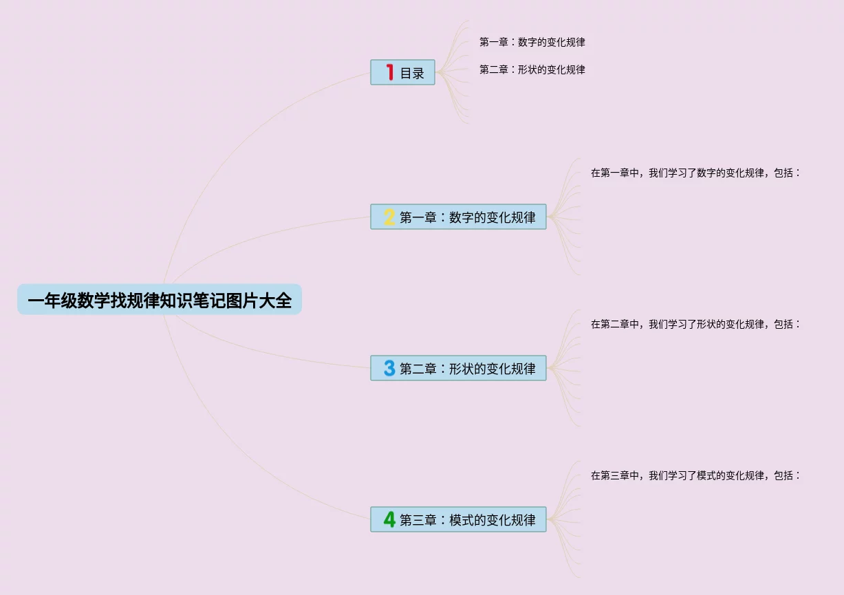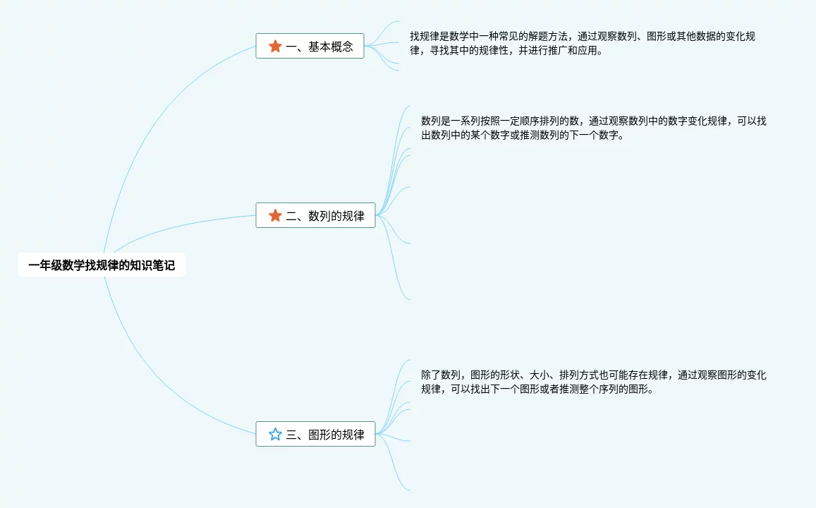 20张一年级数学下找规律思维导图汇总,一年级数学下找规律思维导图,内容涵盖基础知识、找数字规律、找图形规律等3个知识点,20张高清晰可打印,每张思维导图都非常漂亮,每张图片均高清晰可打印。