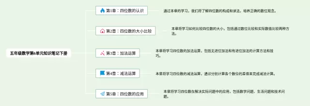 五年级下册第6单元思维导图汇总,五年级数学第6单元思维导图下册,内容涵盖第1章四位数的认识、第2章四位数的大小比较、第3章加法运算、第4章减法运算、第5章四位数的应用等5个部分,24张高清晰可打印,每张思维导图都非常清晰,每张图片均高清晰可打印。