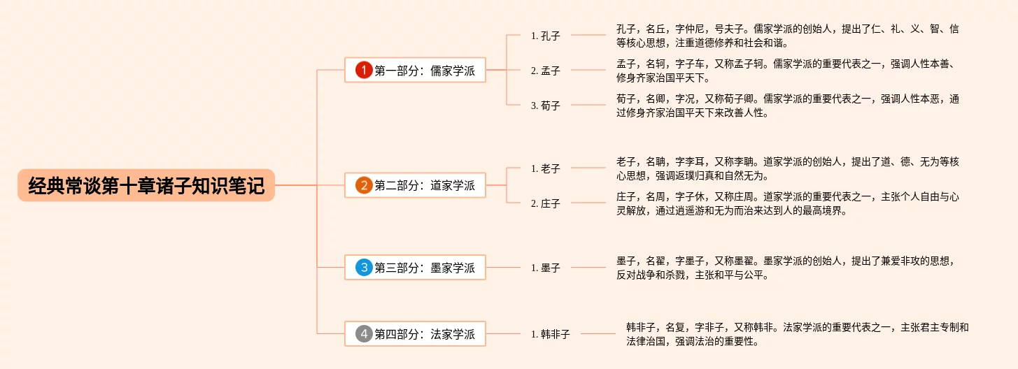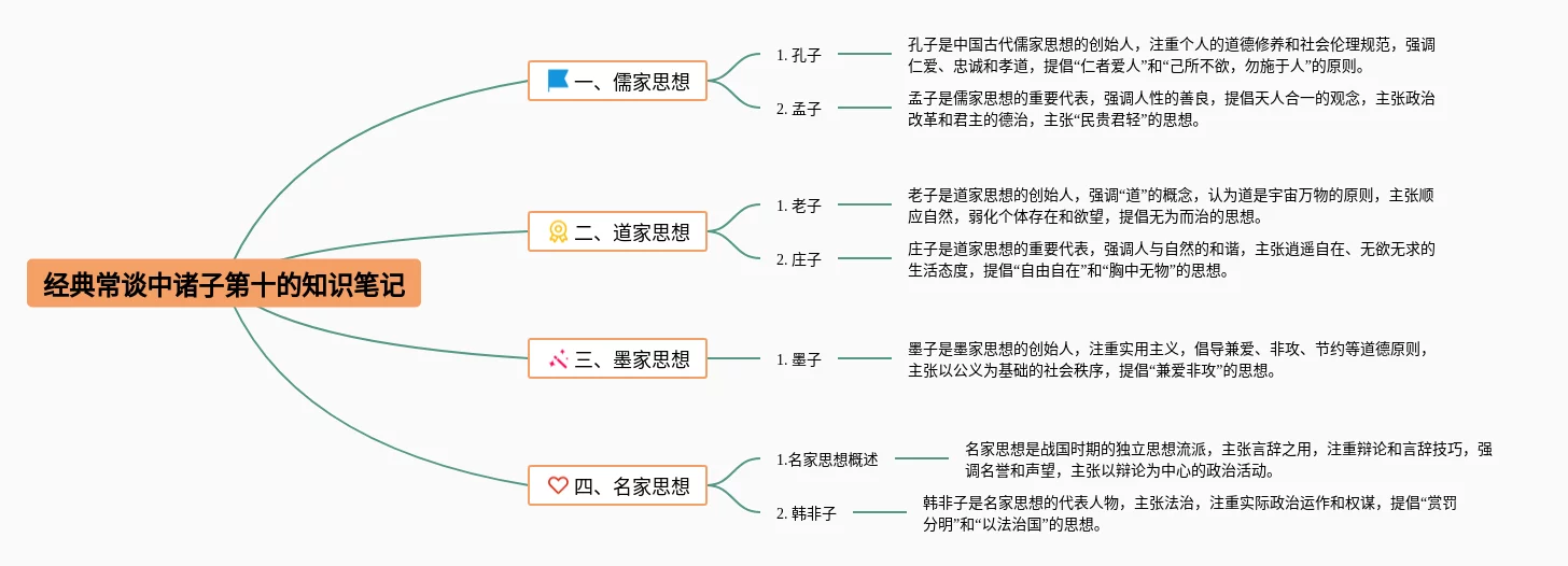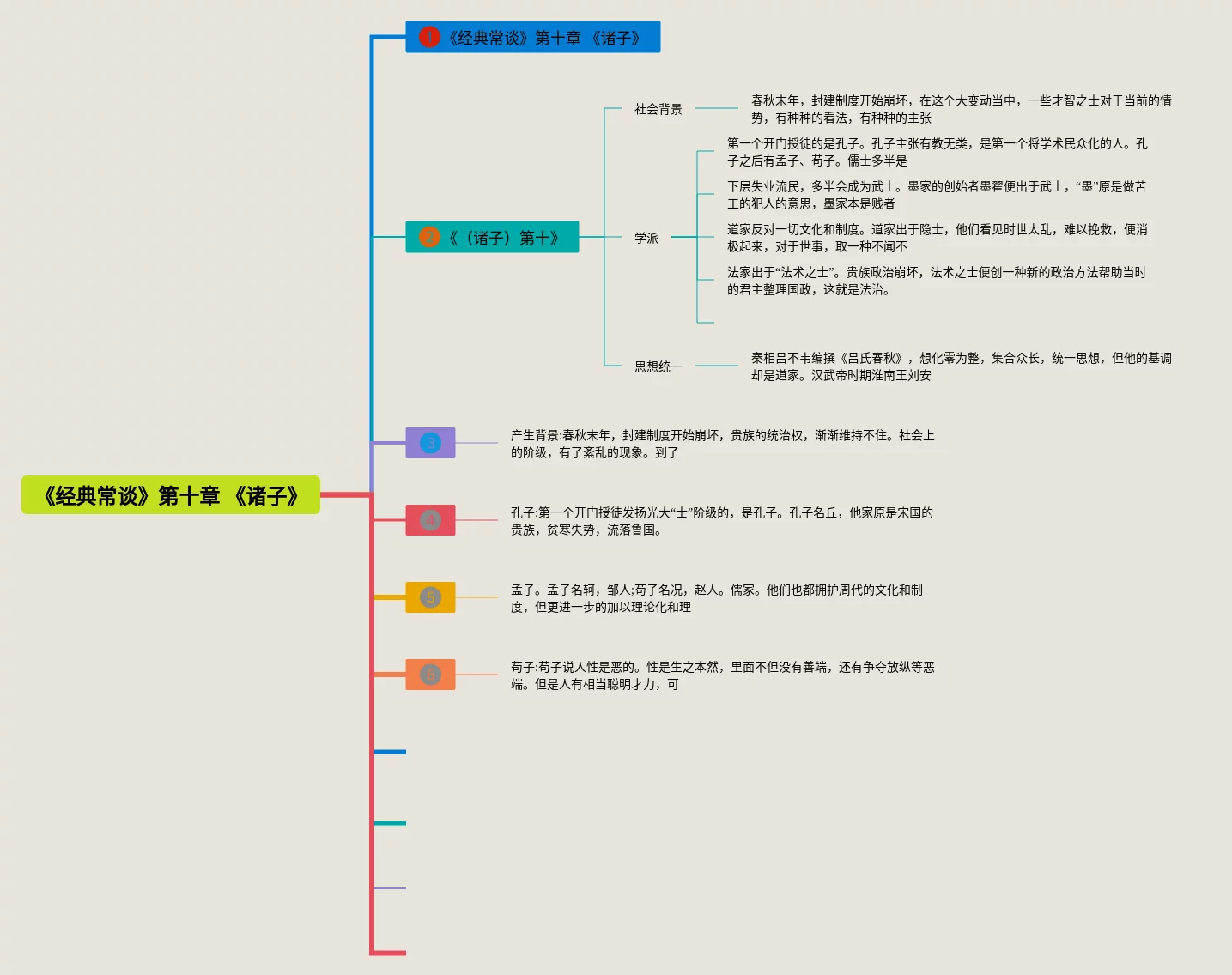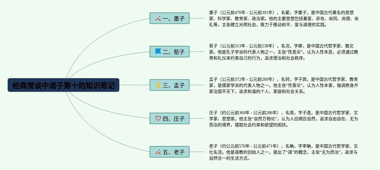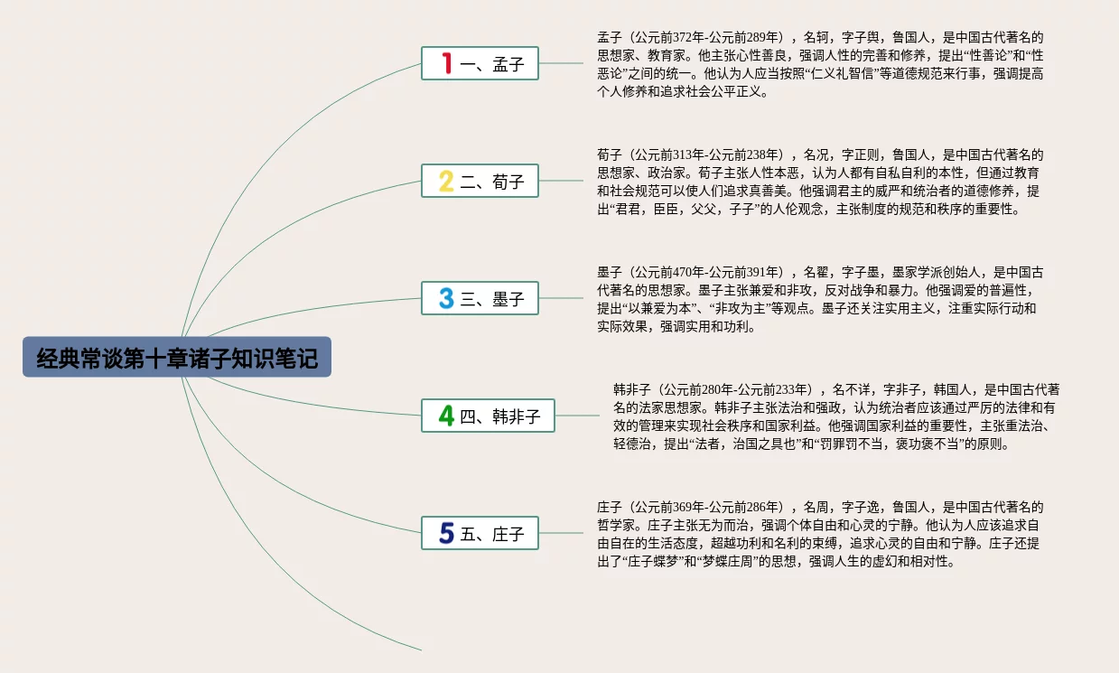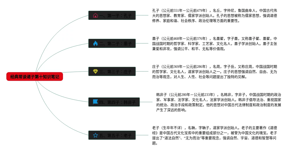 25张经典常谈第十思维导图合集,经典常谈第十思维导图,内容涵盖第一子孔子、第二子墨子、第三子庄子、第四子韩非子、第五子老子等5个知识点,25张高清晰可打印,每张思维导图都非常简单,每张图片均高清晰可打印。