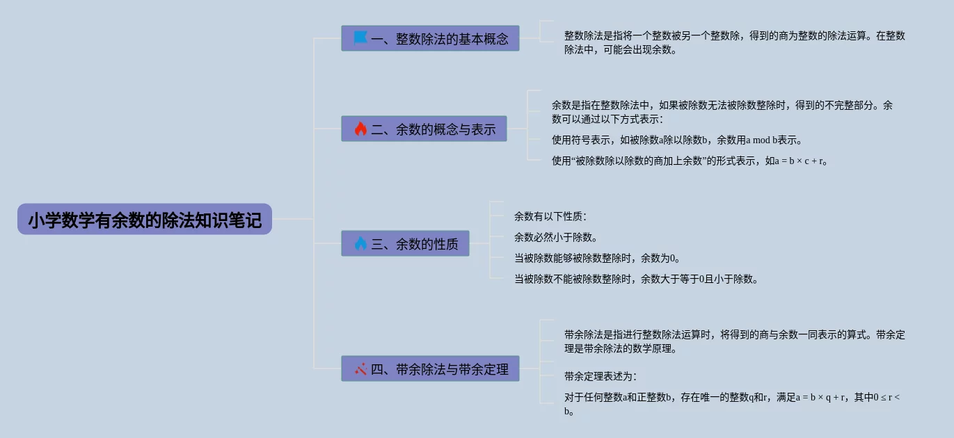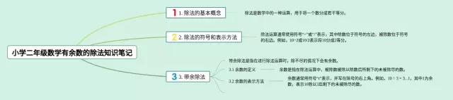 20张小学二年级数学有余数的除法思维导图汇总,小学二年级数学有余数的除法思维导图,内容涵盖1. 除法的基本概念、2. 除法的符号和表示方法、3. 除数的倍数与余数、4. 余数的含义、5. 除法的应用场景等5个部分,20张高清版,每张思维导图都非常漂亮,每张图片均高清版。
