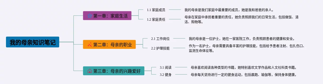 25张我的母亲叫中国思维导图汇总,我的母亲叫中国思维导图,内容涵盖第一章家庭生活、第二章母亲的职业、第三章母亲的兴趣爱好等3个要点,25张高清版,每张思维导图都非常漂亮,每张图片均高清版。