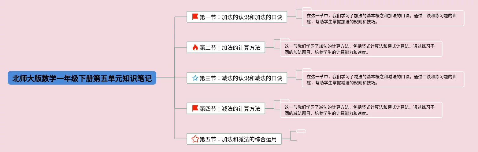 北师大版一年级下册第五单元思维导图汇总,北师大版数学一年级下册第五单元思维导图,内容涵盖语文、数学、英语等3个知识点,23张高清晰可打印,每张思维导图都非常漂亮,每张图片均高清晰可打印。