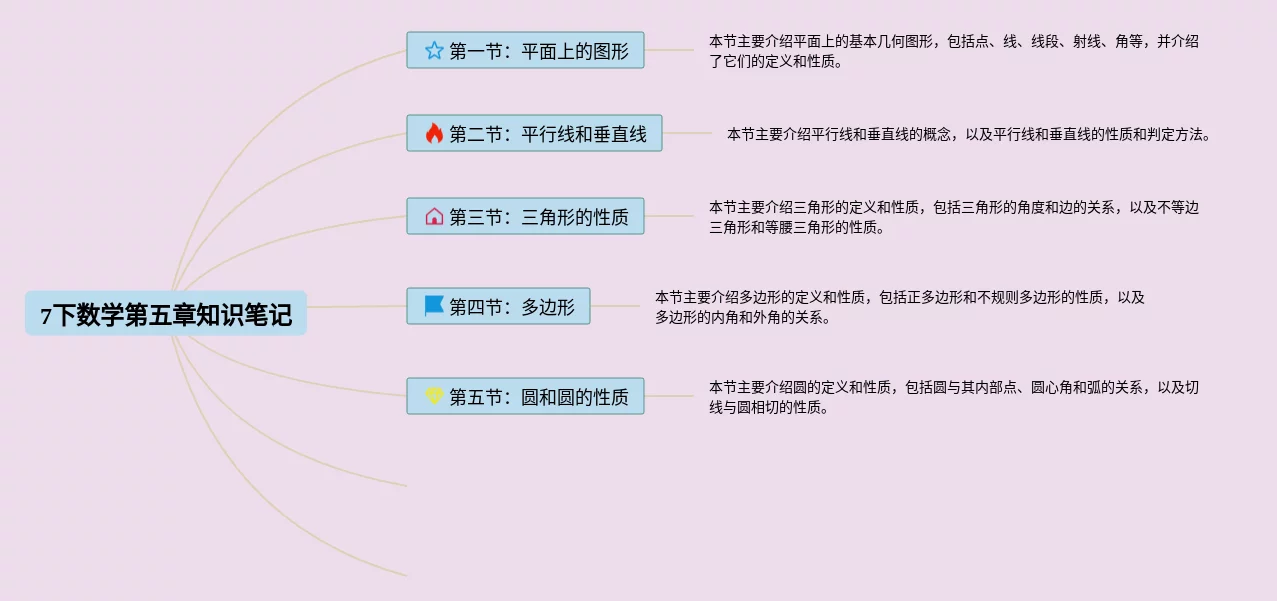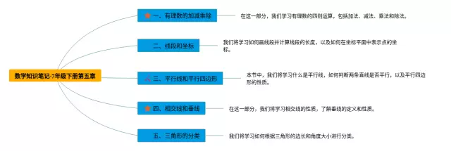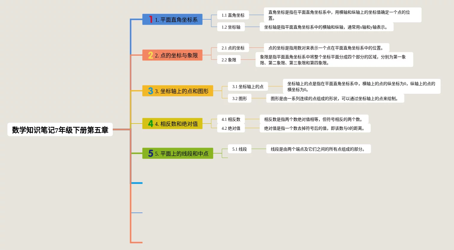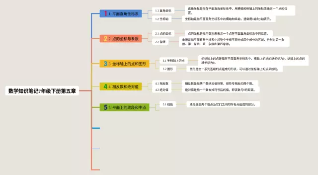 25张7年级下册数学第五章思维导图汇总,7年级下册数学第五章思维导图,内容涵盖1. 平面直角坐标系、2. 点的坐标与象限、3. 坐标轴上的点和图形、4. 相反数和绝对值、5. 平面上的线段和中点等8个知识点,25张可下载,每张思维导图都非常漂亮,每张图片均可下载。