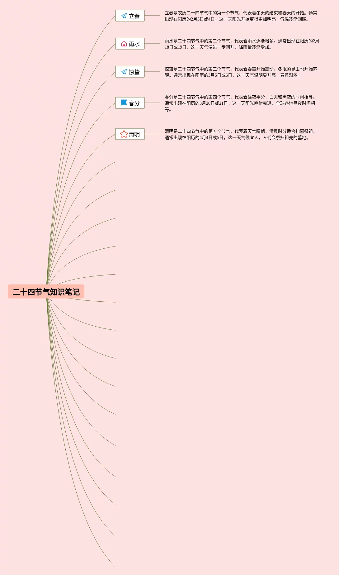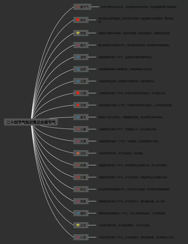 25张二十四节气思维导图全部节气汇总,二十四节气思维导图全部节气,内容涵盖立春、雨水、惊蛰、春分、清明等24个部分,25张高清晰可打印,每张思维导图都非常漂亮,每张图片均高清晰可打印。