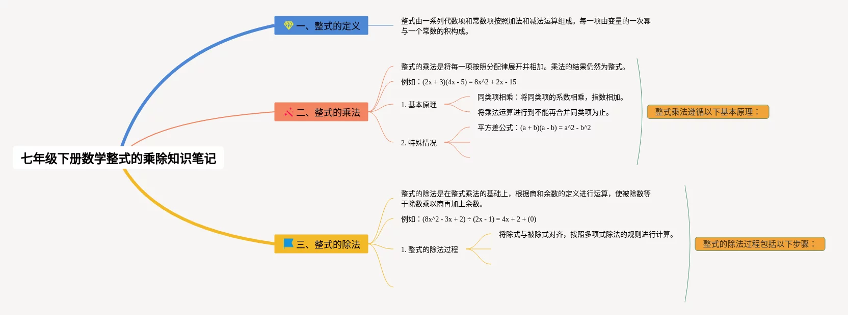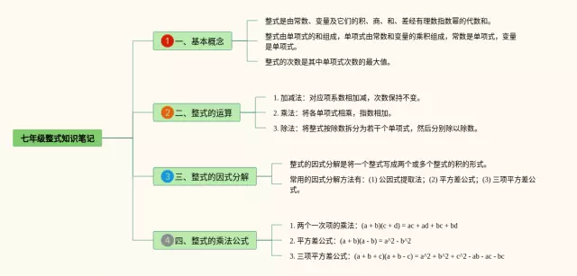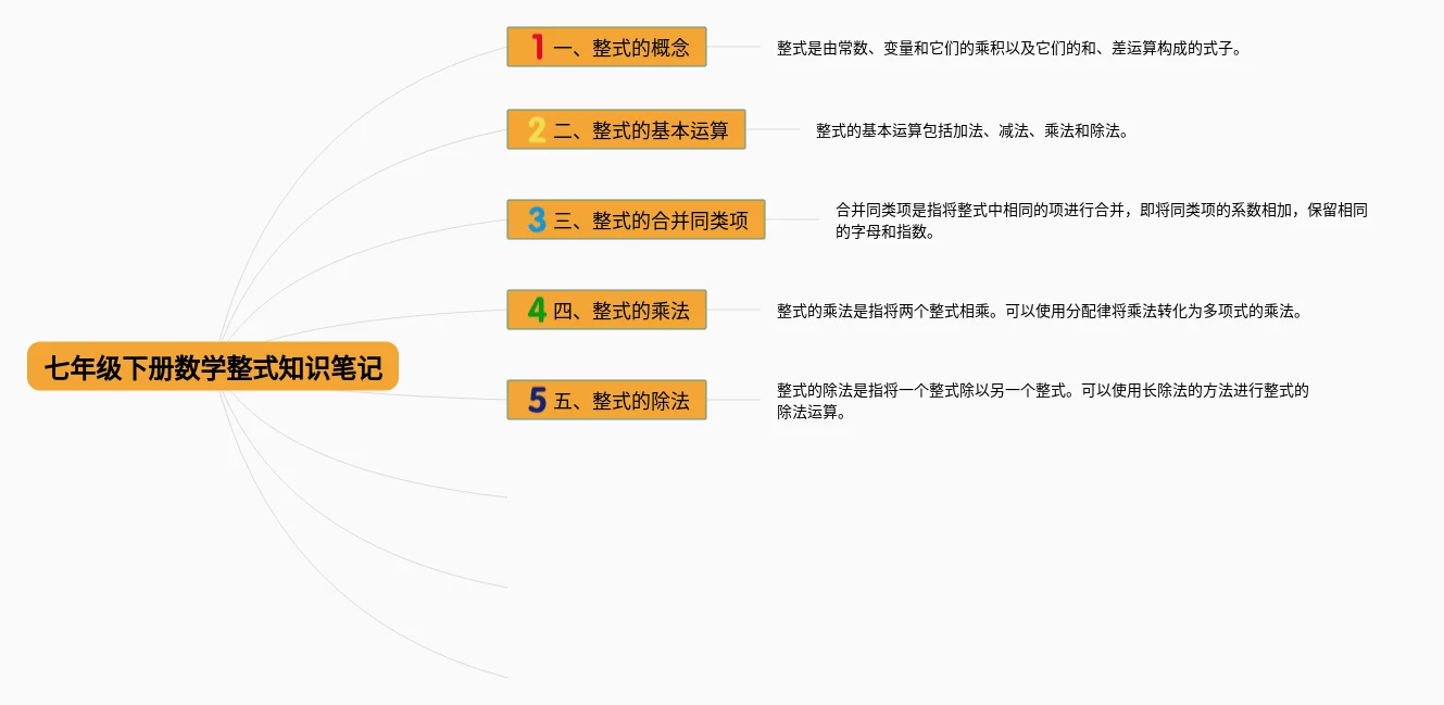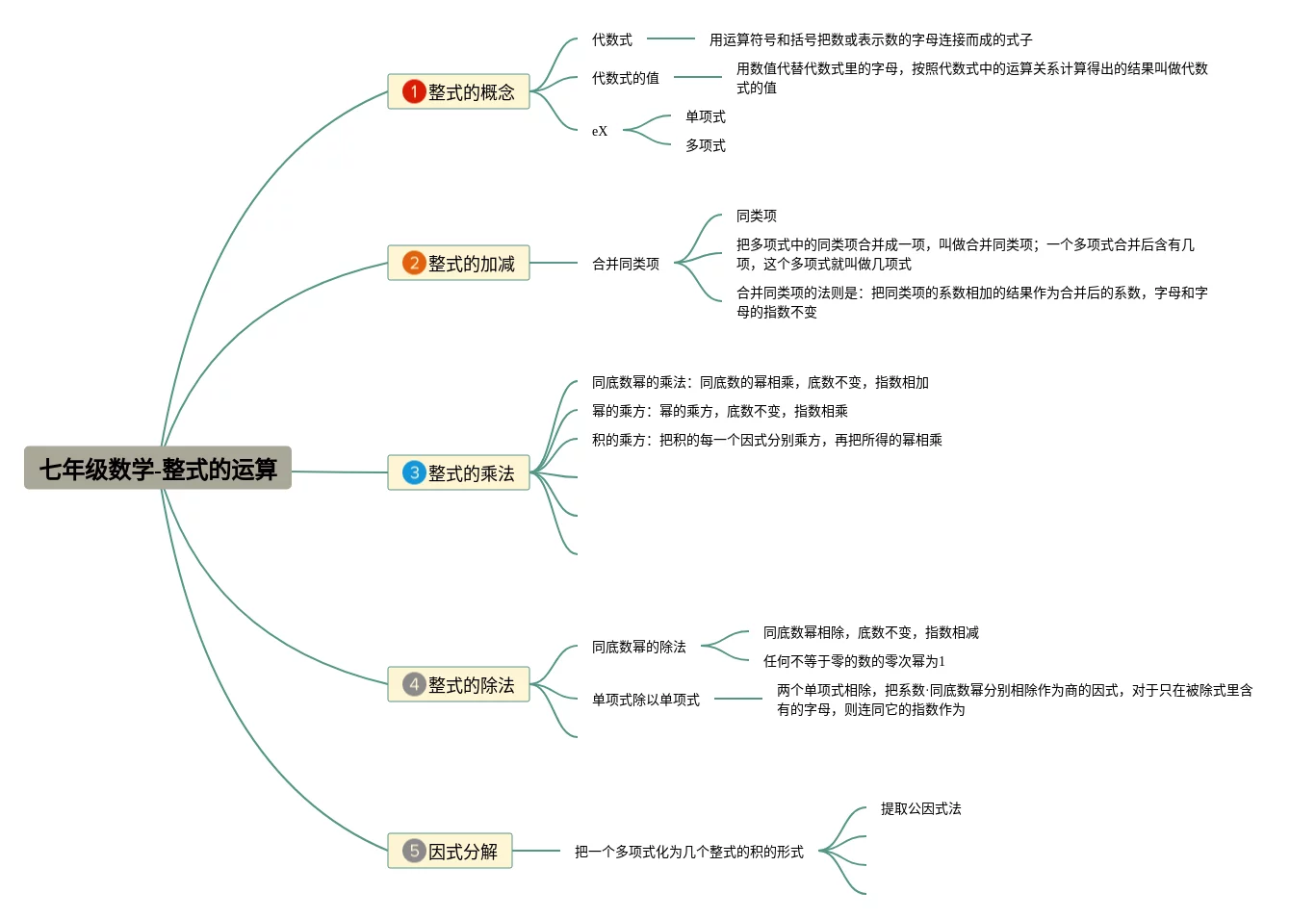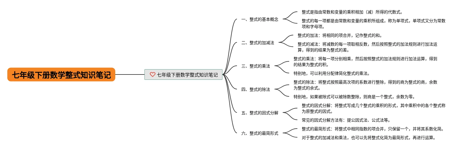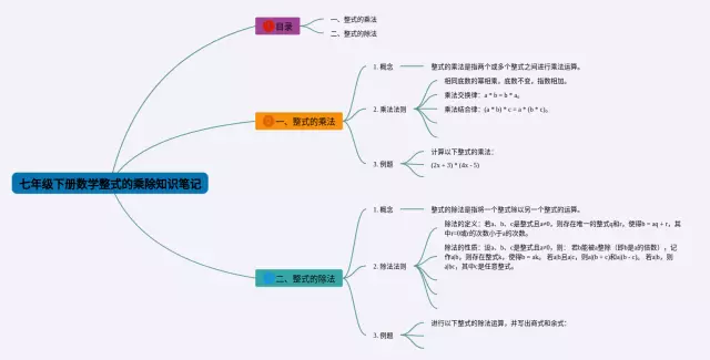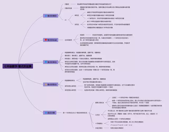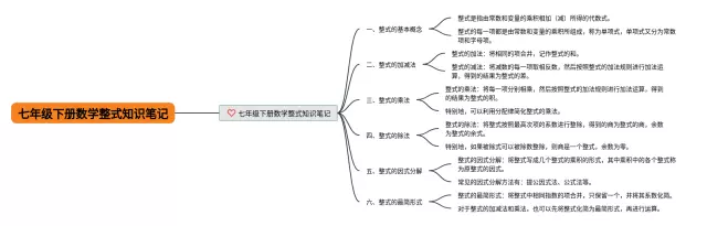 21张七年级下册数学整式思维导图合集,七年级下册数学整式思维导图,内容涵盖整式的概念、整式的加减、整式的乘法、整式的除法、因式分解等5个部分,21张可打印,每张思维导图都非常漂亮,每张图片均可打印。