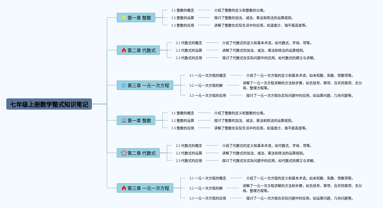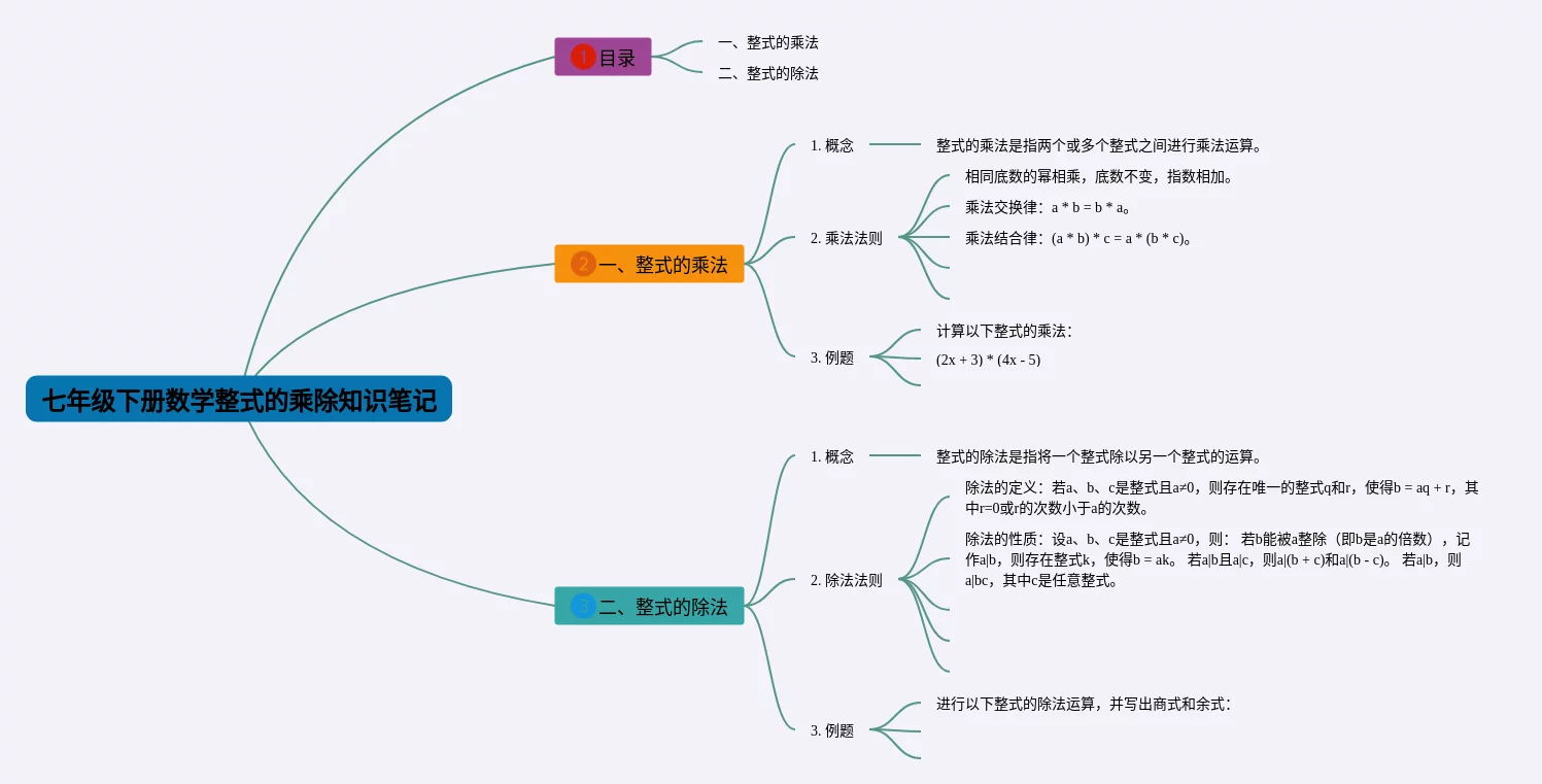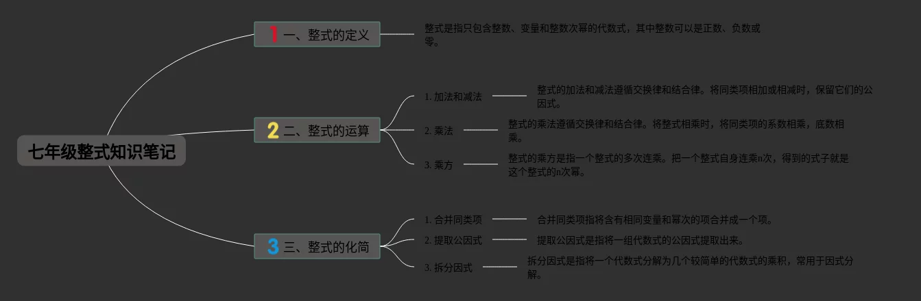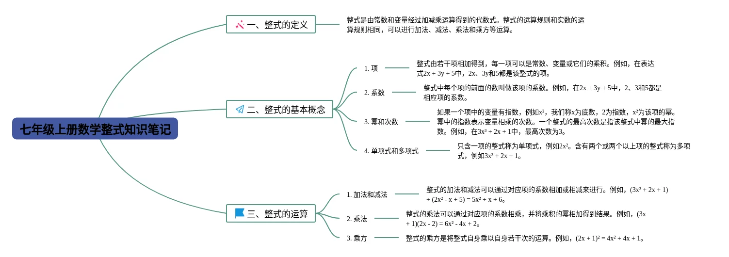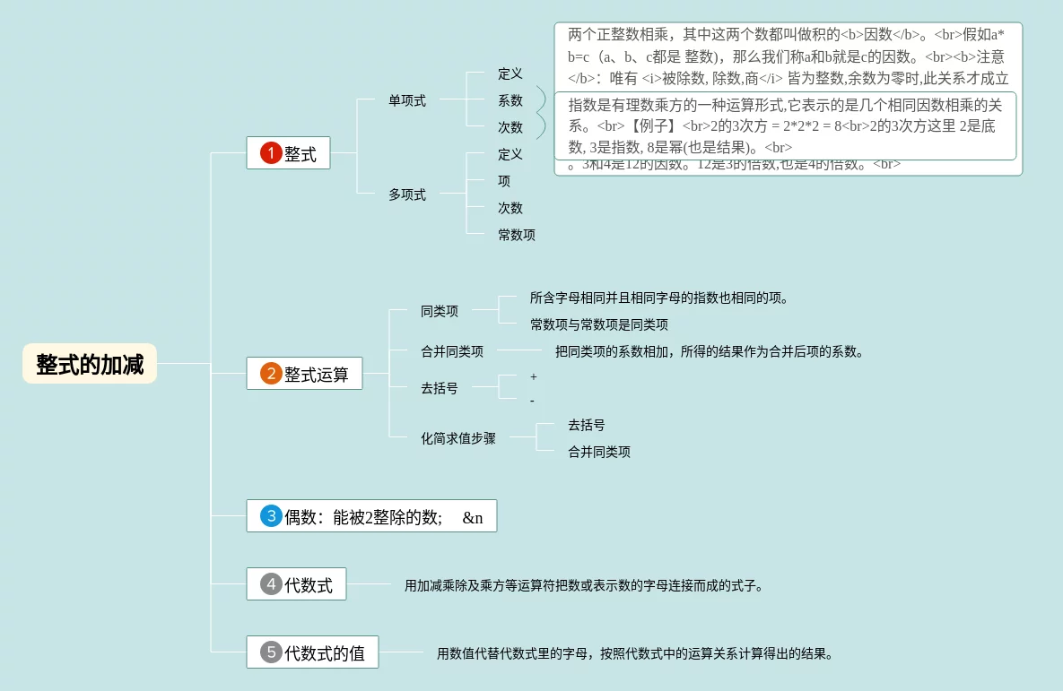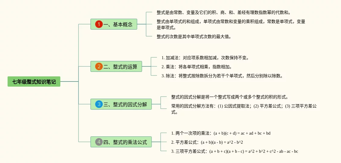 21张七年级下册数学整式思维导图合集,七年级下册数学整式思维导图,内容涵盖整式的概念、整式的加减、整式的乘法、整式的除法、因式分解等5个部分,21张可打印,每张思维导图都非常漂亮,每张图片均可打印。