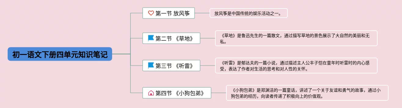 初一下册思维导图合集,初一语文下册思维导图,内容涵盖第一节 放风筝、第二节 《草地》、第三节 《听雷》、第四节 《小狗包弟》等4个部分,21张可下载,每张思维导图都非常清晰,每张图片均可下载。