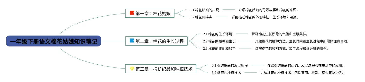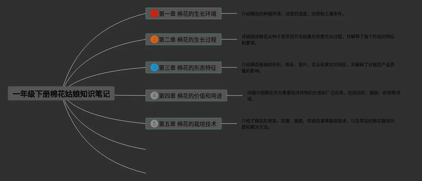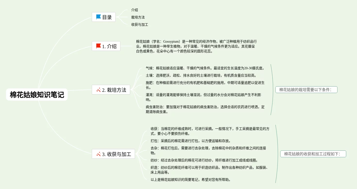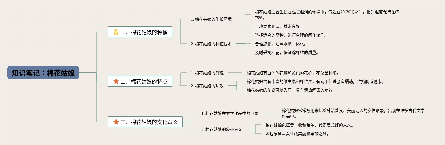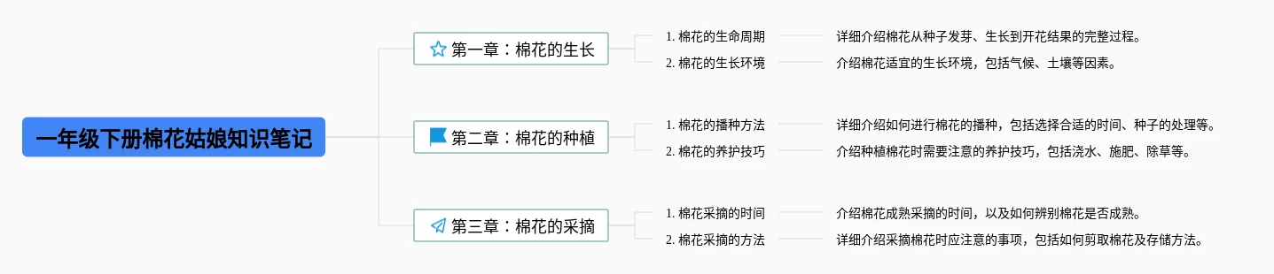 20张一年级下册语文棉花姑娘思维导图合集,一年级下册语文棉花姑娘思维导图,内容涵盖目录、1. 简介、2. 起源、3. 特点、4. 栽培方法等6个要点,20张值得收藏,每张思维导图都非常清晰,每张图片均值得收藏。