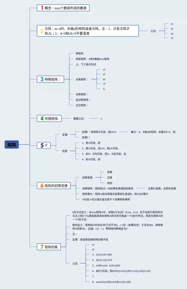 22张矩阵 思维导图合集,矩阵 思维导图,内容涵盖概念mxn个数排列成的数表、特殊矩阵、伴随矩阵、矩阵的初等变换、矩阵的秩等5个知识点,22张高清版,每张思维导图都非常简单,每张图片均高清版。