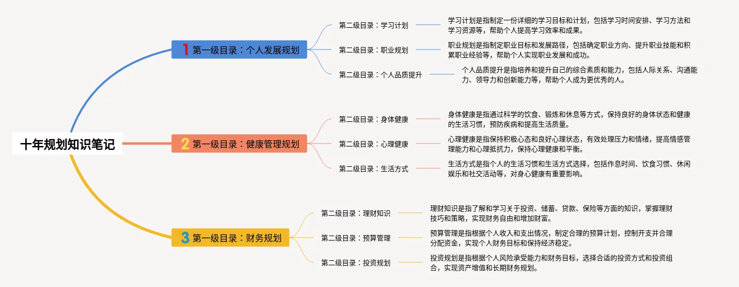 23张十年规划思维导图合集,十年规划思维导图,内容涵盖第一级目录个人发展规划、第一级目录健康管理规划、第一级目录财务规划等3个部分,23张附打印高清版,每张思维导图都非常清晰,每张图片均附打印高清版。