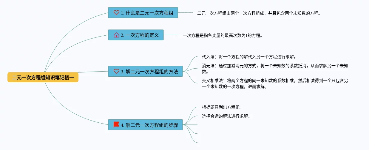 24张初一数学二元一次方程组思维导图合集,初一数学二元一次方程组思维导图,内容涵盖二元一次方程组的定义、解二元一次方程组的方法、二元一次方程组的解的情况等3个知识点,24张附下载,每张思维导图都非常清晰,每张图片均附下载。