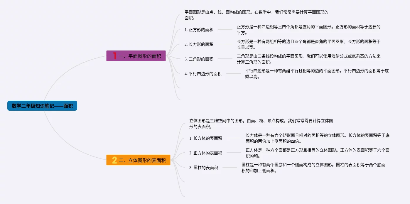 22张数学三年级面积的思维导图合集,数学三年级面积的思维导图,内容涵盖基础知识、相应题型、与周长的区别与联系、思辨题型、解决问题等5个要点,22张值得收藏,每张思维导图都非常清晰,每张图片均值得收藏。
