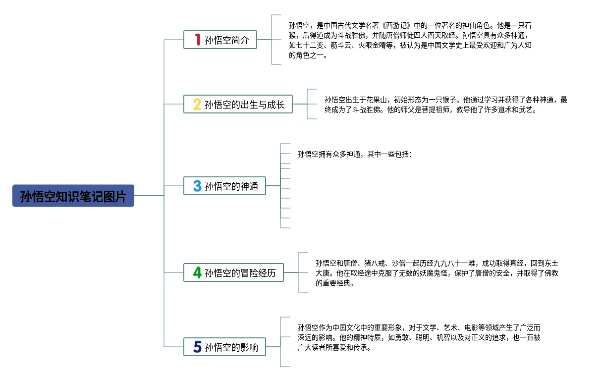 23张思维导图孙悟空汇总,思维导图孙悟空,内容涵盖基本信息、早年经历、保护唐僧取经、神通广大、性格特点等5个要点,23张高清版,每张思维导图都非常清晰,每张图片均高清版。