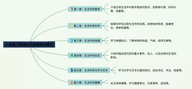 22张六年级下册综合与实践思维导图合集,六年级下册综合与实践思维导图,内容涵盖第一章生活中的数学、第二章生活中的科学、第三章生活中的地理、第四章生活中的历史、第五章生活中的文学与艺术等6个方面,22张高清晰可打印,每张思维导图都非常简单,每张图片均高清晰可打印。