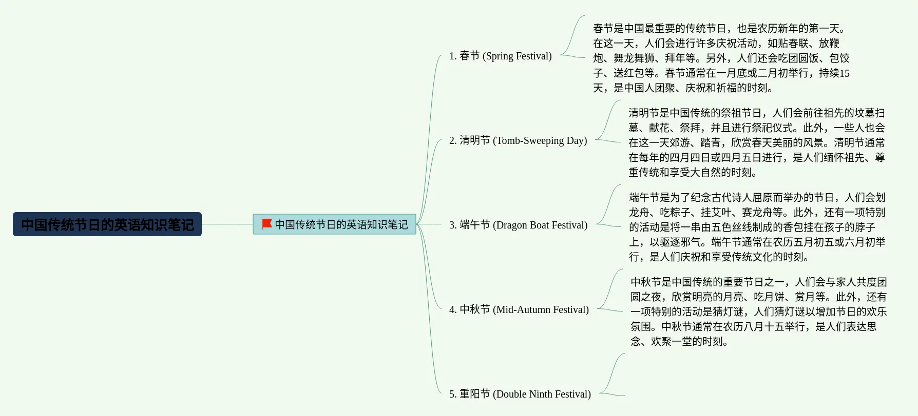 24张中国传统节日的英语思维导图汇总,中国传统节日的英语思维导图,内容涵盖春节 (Spring Festival)、元宵节 (Lantern Festival)、清明节 (Tomb-Sweeping Day)、端午节 (Dragon Boat Festival)、中秋节 (Mid-Autumn Festival)等5个知识点,24张值得收藏,每张思维导图都非常清晰,每张图片均值得收藏。