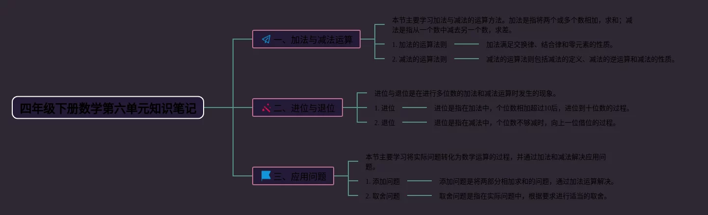 20张四年级下册数学思维导图第六单元.汇总,四年级下册数学思维导图第六单元.,内容涵盖加法与减法运算、进位与退位、应用问题等3个知识点,20张精选版,每张思维导图都非常漂亮,每张图片均精选版。