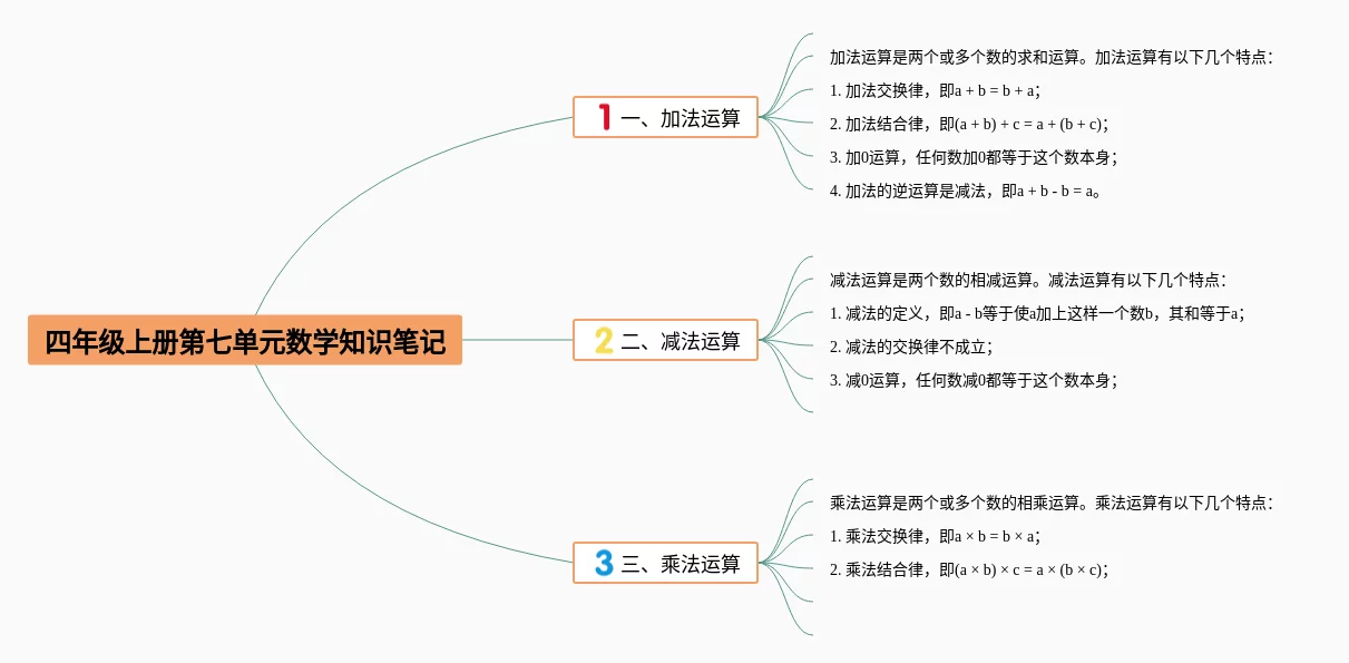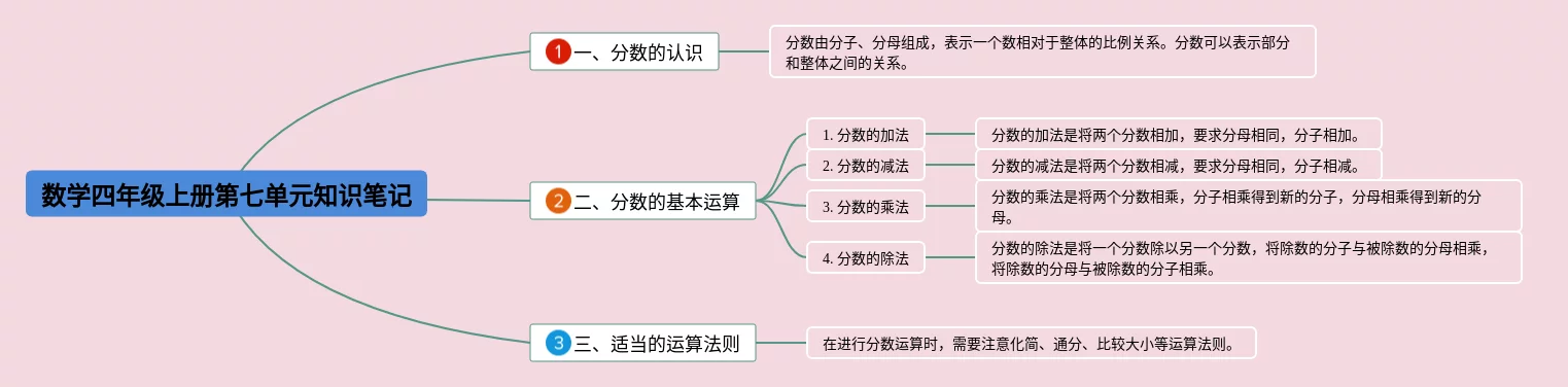 四年级上册第七单元思维导图合集,四年级上册第七单元数学思维导图,内容涵盖分数的认识、分数的基本运算、适当的运算法则等3个方面,24张可下载,每张思维导图都非常清晰,每张图片均可下载。