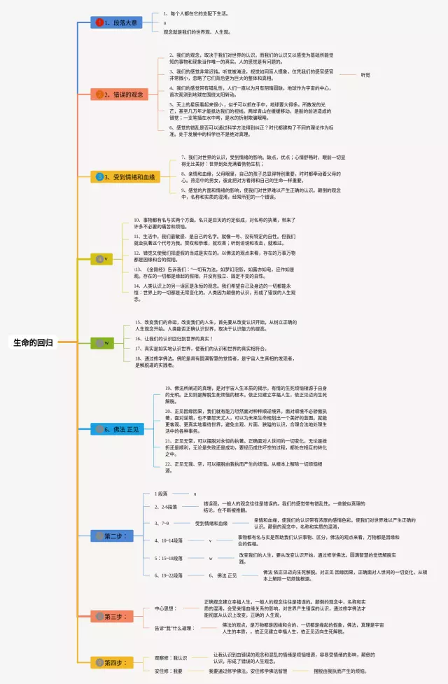 25张生命的回归思维导图合集,生命的回归思维导图,内容涵盖段落大意、错误的观念、受到情绪和血缘、佛法 正见、第二步等7个部分,25张附打印高清版,每张思维导图都非常简单,每张图片均附打印高清版。