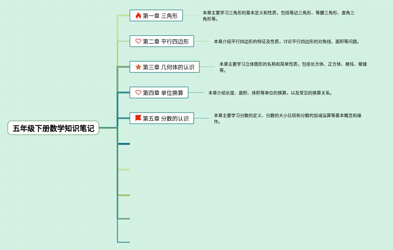 23张五年级下册数学思维导图清楚汇总,五年级下册数学思维导图清楚,内容涵盖第一章 分数的认识、第二章 分数的比较、第三章 分数的加减等3个知识点,23张可打印,每张思维导图都非常漂亮,每张图片均可打印。