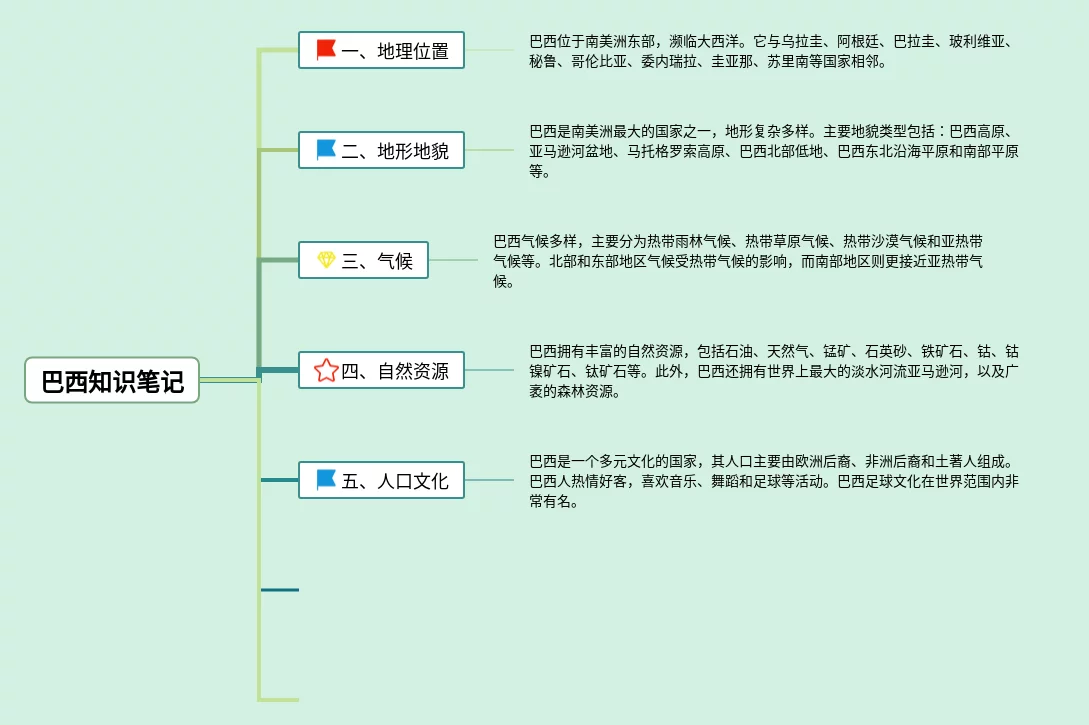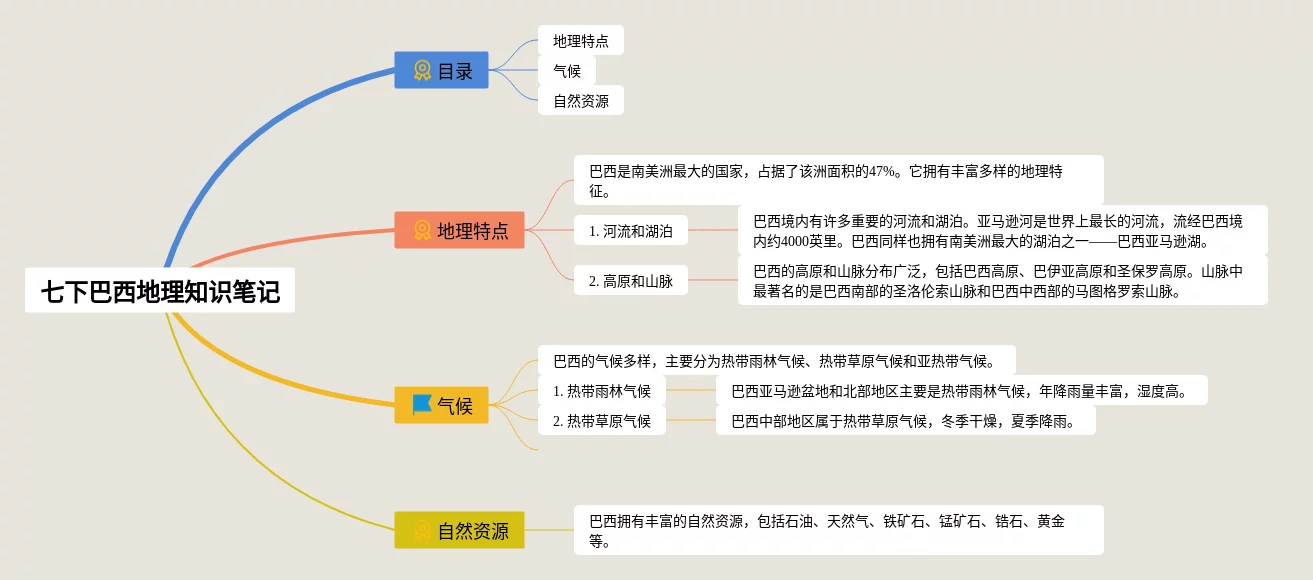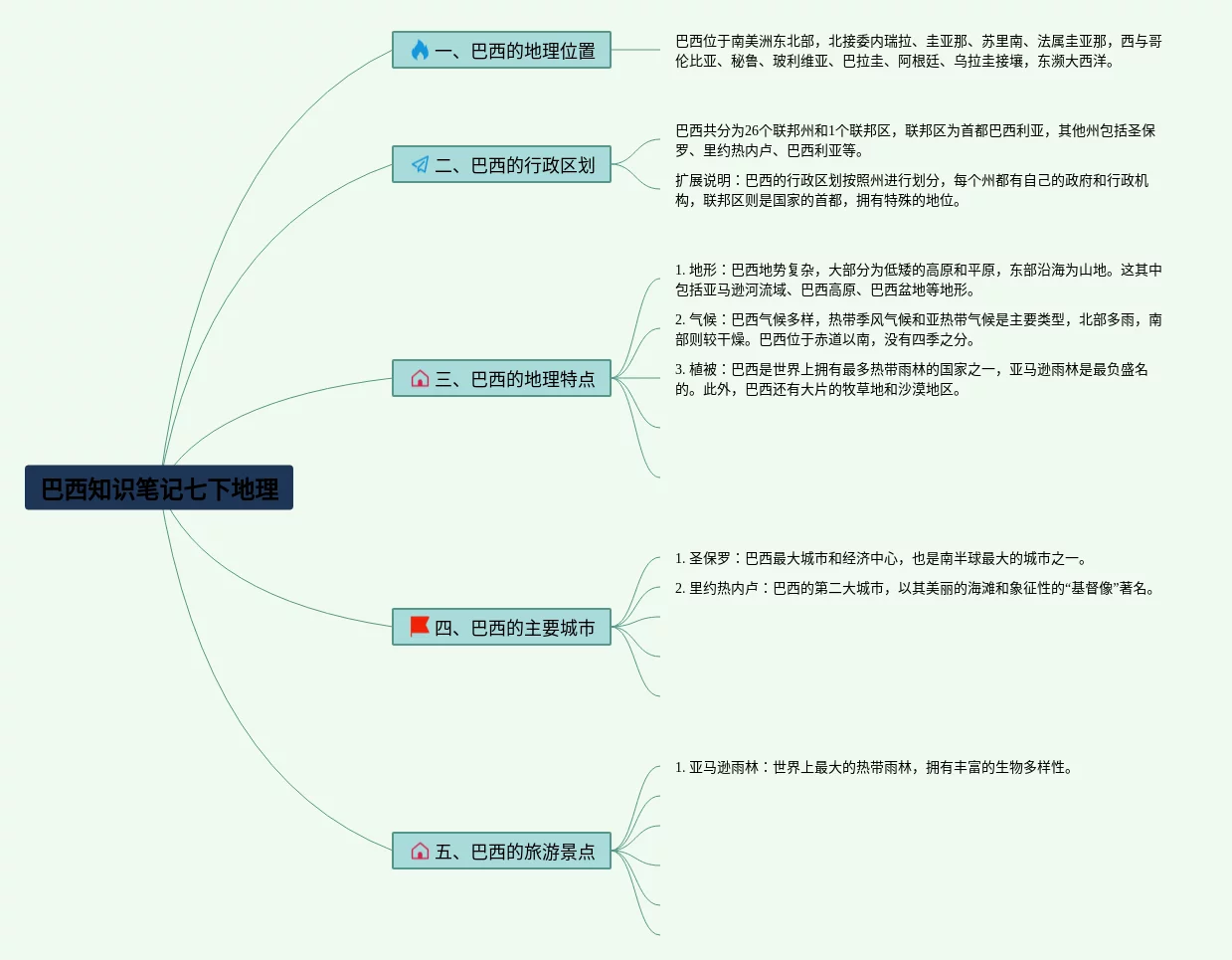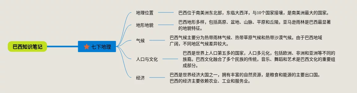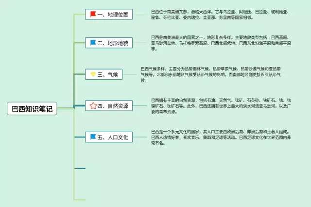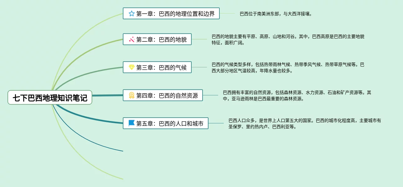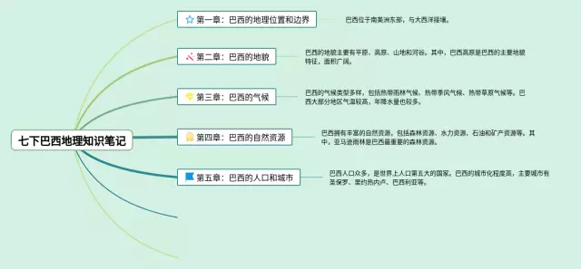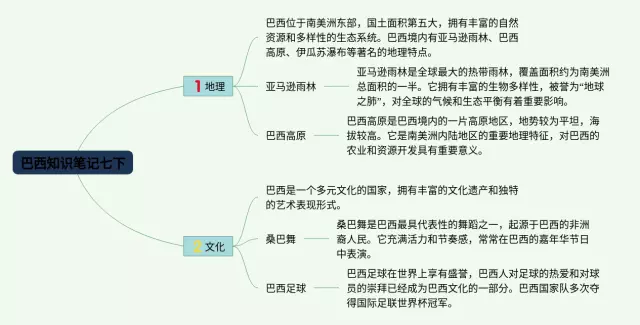25张巴西思维导图七下地理合集,巴西思维导图七下地理,内容涵盖第一章巴西的地理位置和边界、第二章巴西的地貌、第三章巴西的气候、第四章巴西的自然资源、第五章巴西的人口和城市等7个方面,25张值得收藏,每张思维导图都非常简单,每张图片均值得收藏。