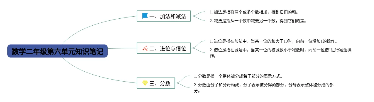 小学二年级第六单元思维导图合集,小学数学二年级第六单元思维导图,内容涵盖加法和减法、进位与借位、分数等3个部分,22张高清晰可打印,每张思维导图都非常简单,每张图片均高清晰可打印。