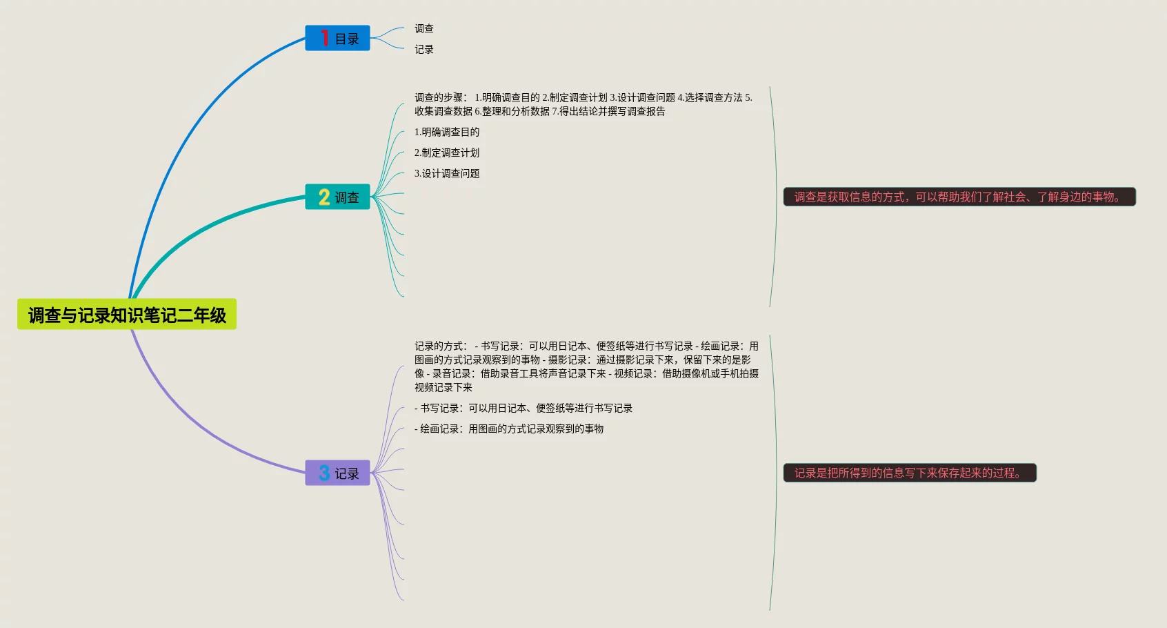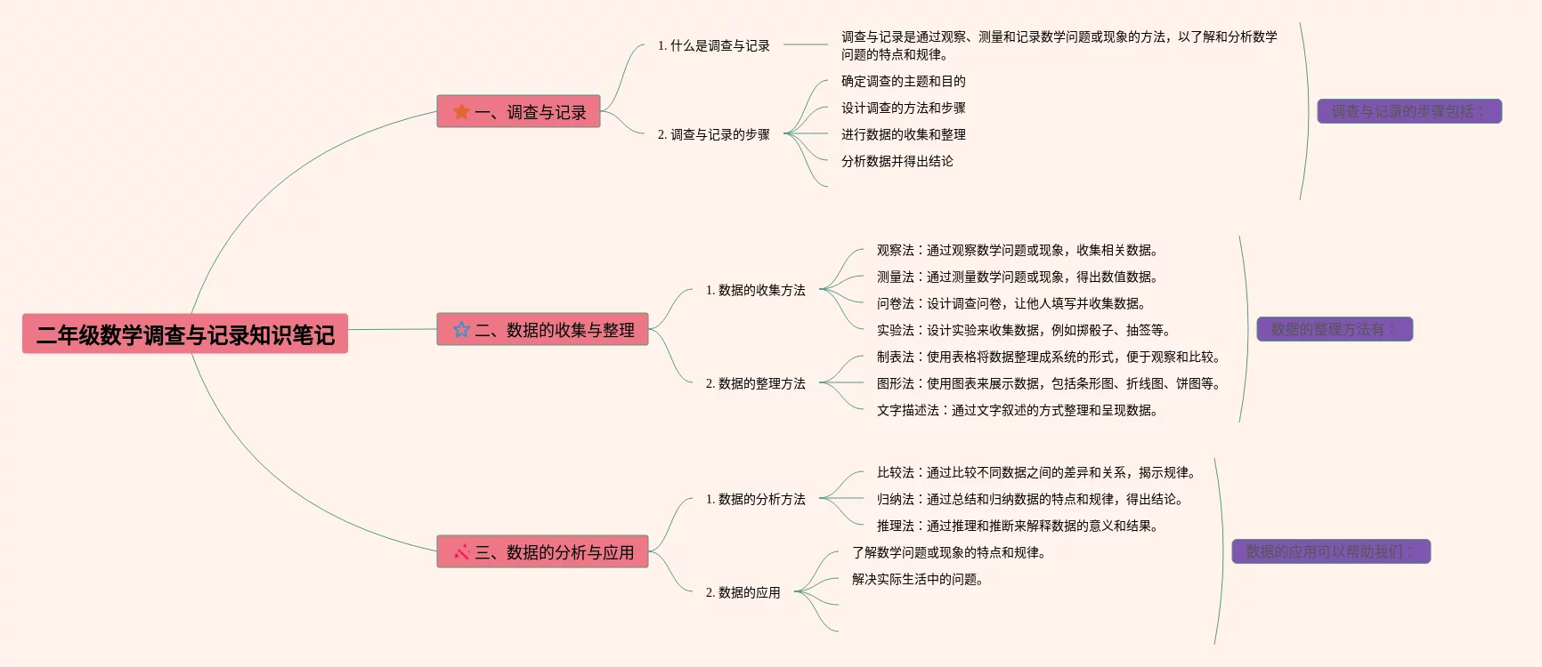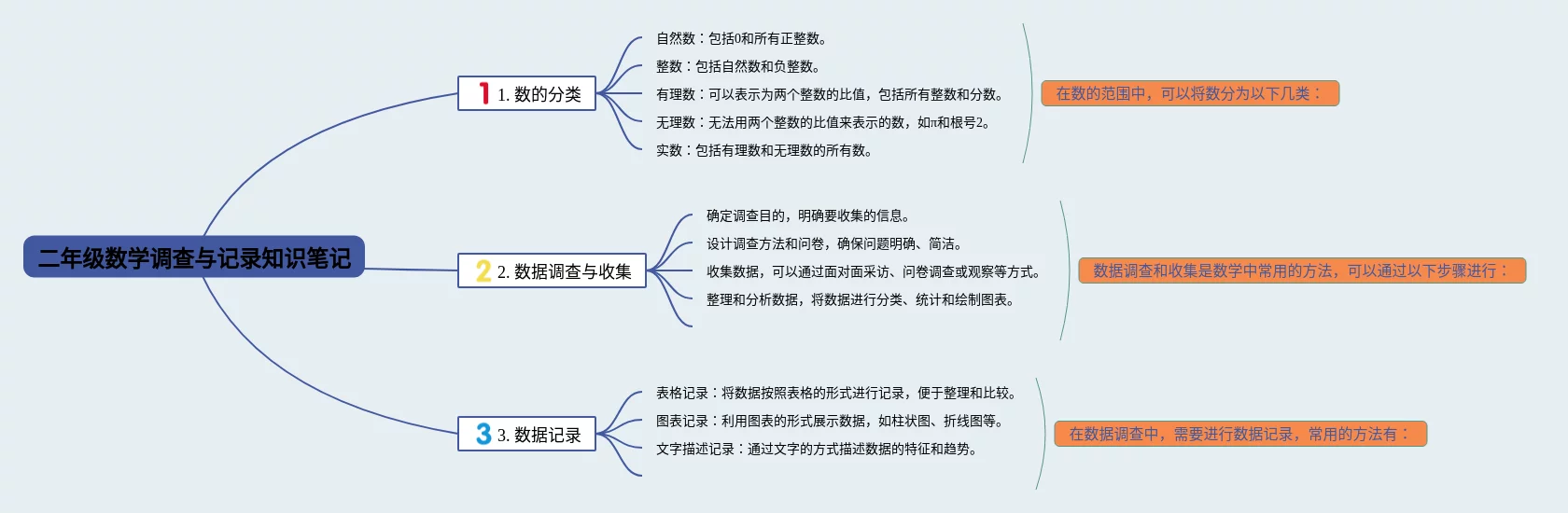 22张调查与记录思维导图二年级汇总,调查与记录思维导图二年级,内容涵盖1. 数的分类、2. 数据调查与收集、3. 数据记录等3个要点,22张精选版,每张思维导图都非常简单,每张图片均精选版。