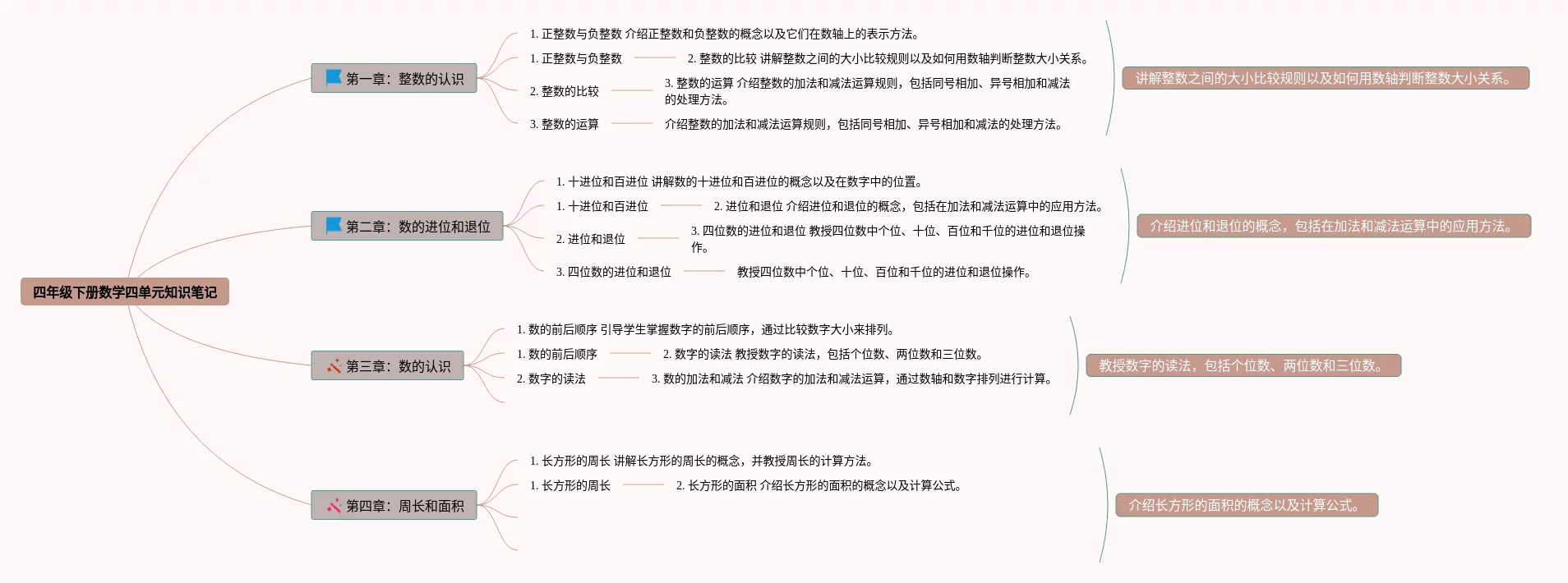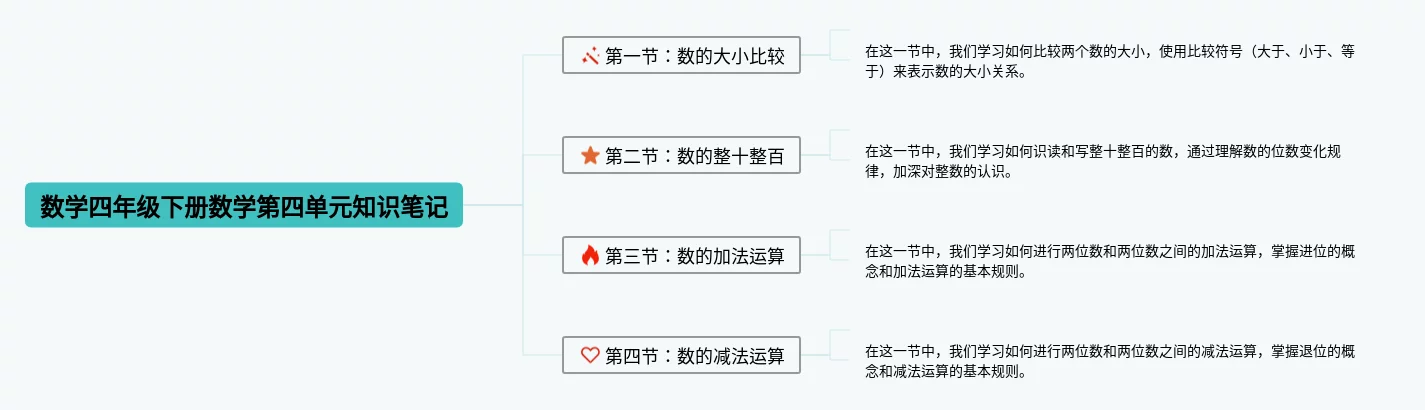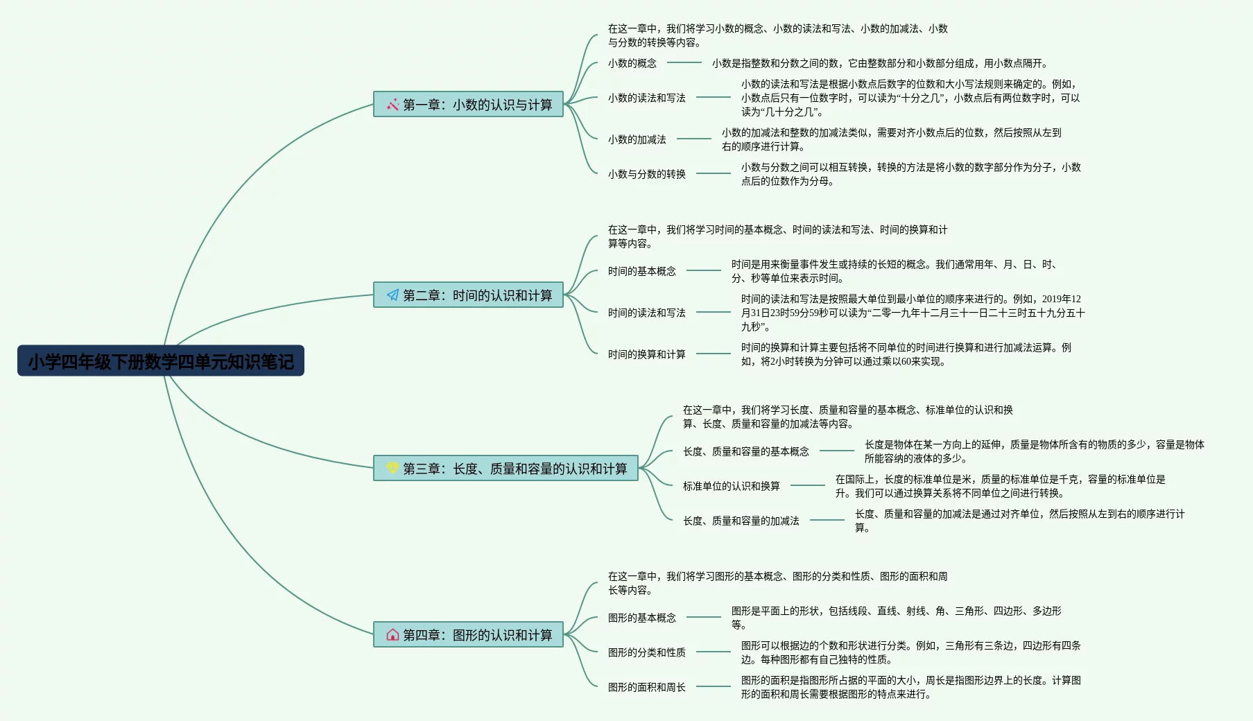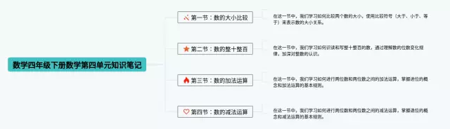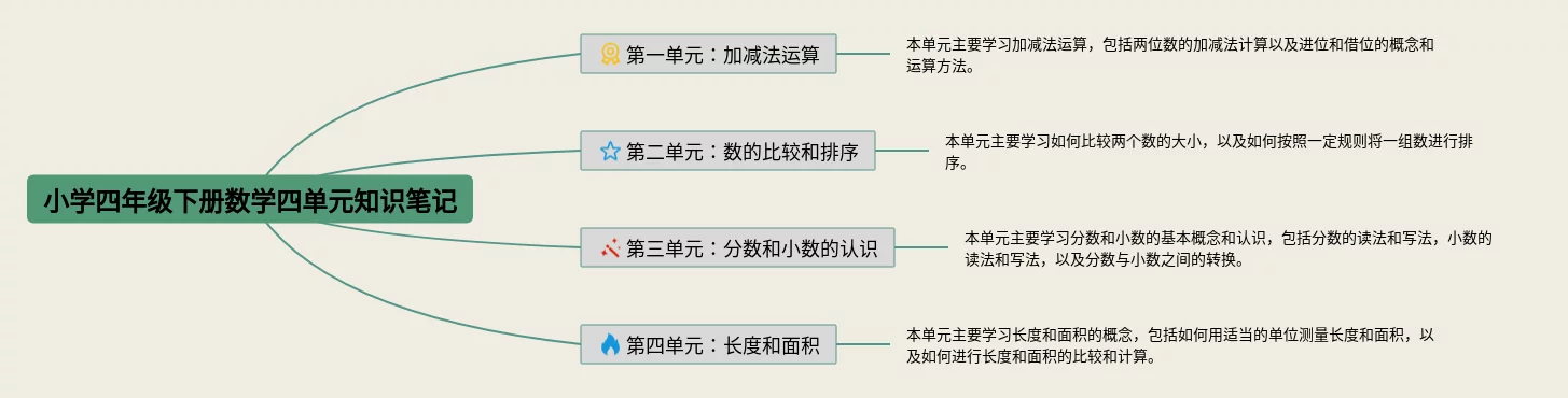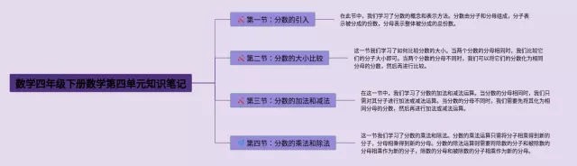 21张四年级下册数学四单元思维导图汇总,四年级下册数学四单元思维导图,内容涵盖第一单元加减法运算、第二单元数的比较和排序、第三单元分数和小数的认识、第四单元长度和面积等4个知识点,21张高清版,每张思维导图都非常简单,每张图片均高清版。