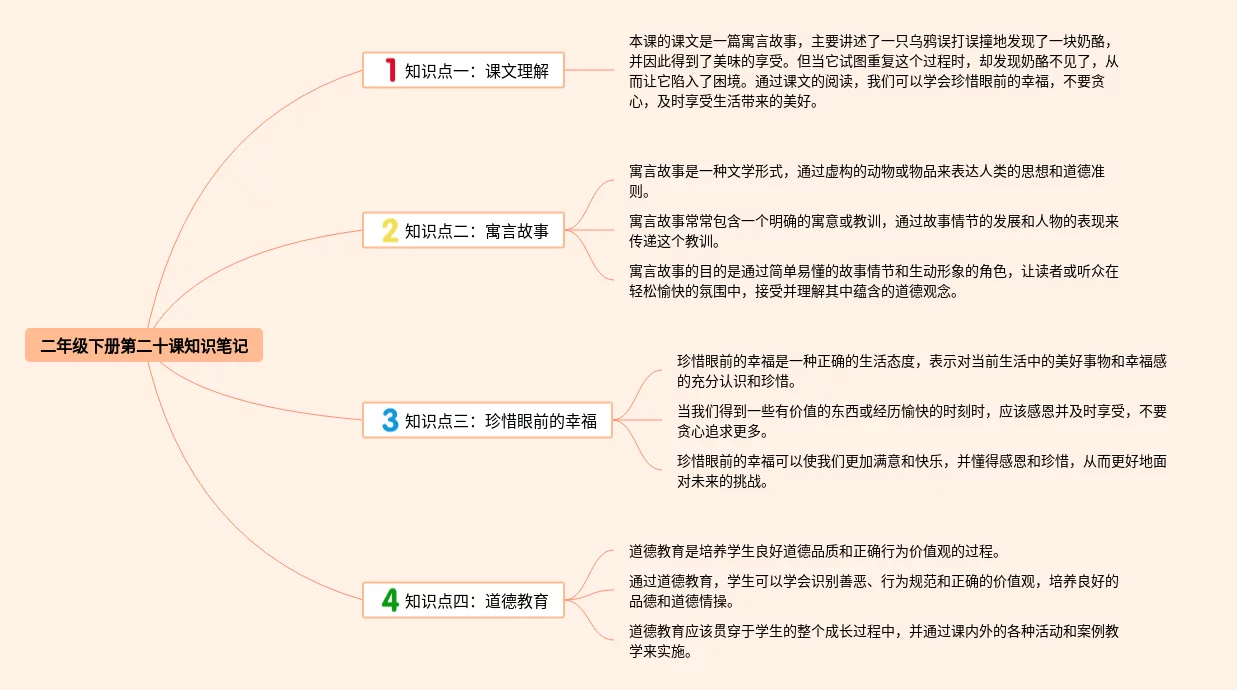 二年级下册第二十课思维导图汇总,二年级下册第二十课思维导图,内容涵盖知识点课文理解、知识点寓言故事、知识点珍惜眼前的幸福、知识点道德教育等4个要点,21张值得收藏,每张思维导图都非常简单,每张图片均值得收藏。