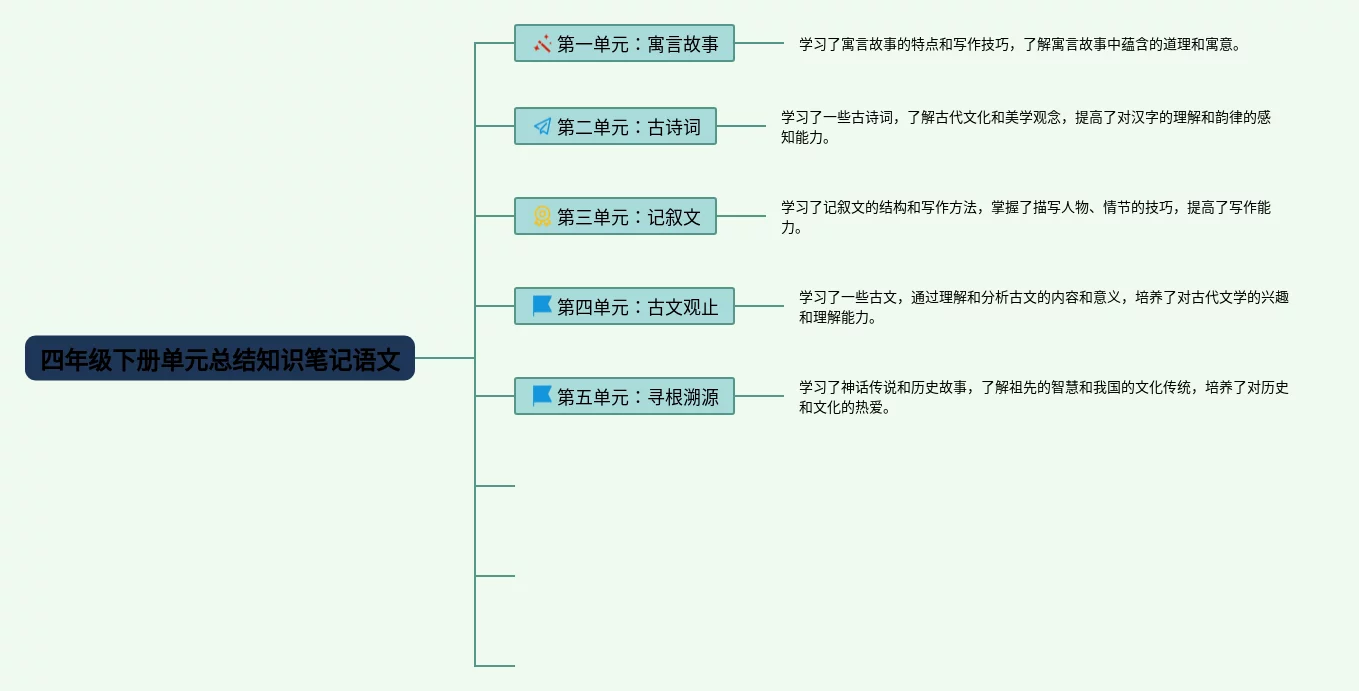 21张四年级下册七单元总结思维导图汇总,四年级下册七单元总结思维导图,内容涵盖第一单元寓言故事、第二单元古诗词、第三单元记叙文、第四单元古文观止、第五单元寻根溯源等8个知识点,21张高清晰可打印,每张思维导图都非常清晰,每张图片均高清晰可打印。